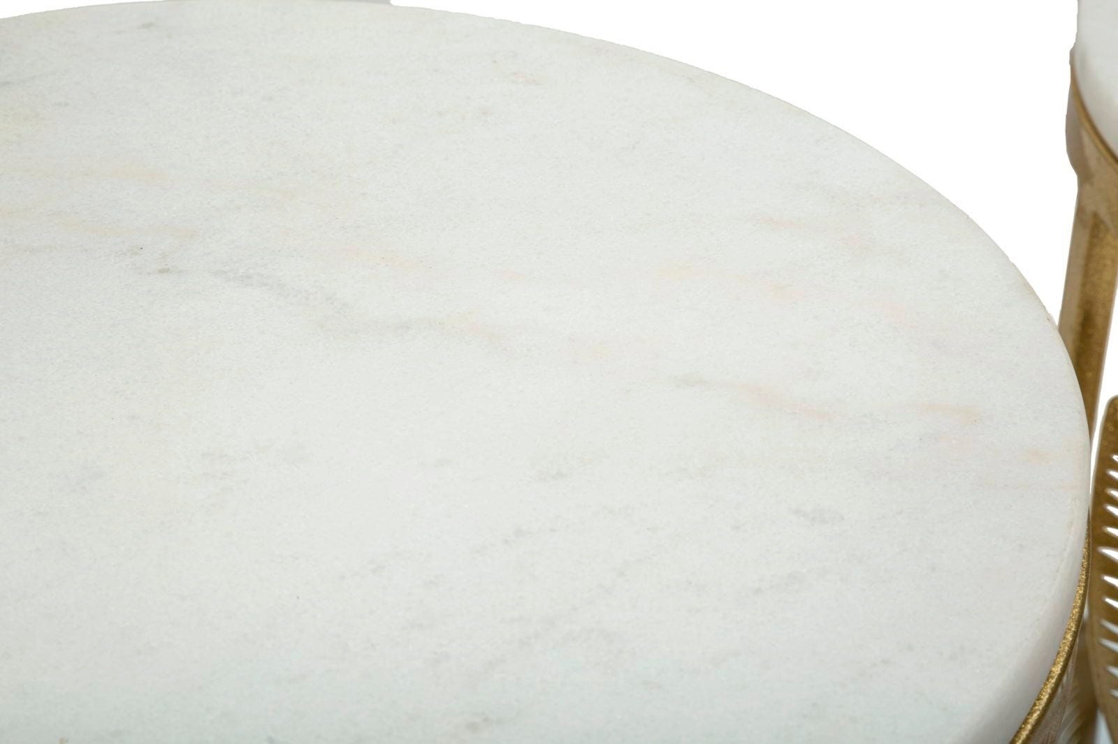 Stelaż z pozłacanego metalu zdobią kunsztownie wykonane, filigranowe liście, które elegancko pną się po wspornikach. Dopełnieniem designu jest blat o szlachetnym wyglądzie białego marmuru, który tworzy klasyczny kontrast z ciepłym odcieniem złota. Niezależnie od tego, czy zostaną ustawione w duecie, czy osobno – ten zestaw nada każdemu pomieszczeniu wyjątkowy charakter.