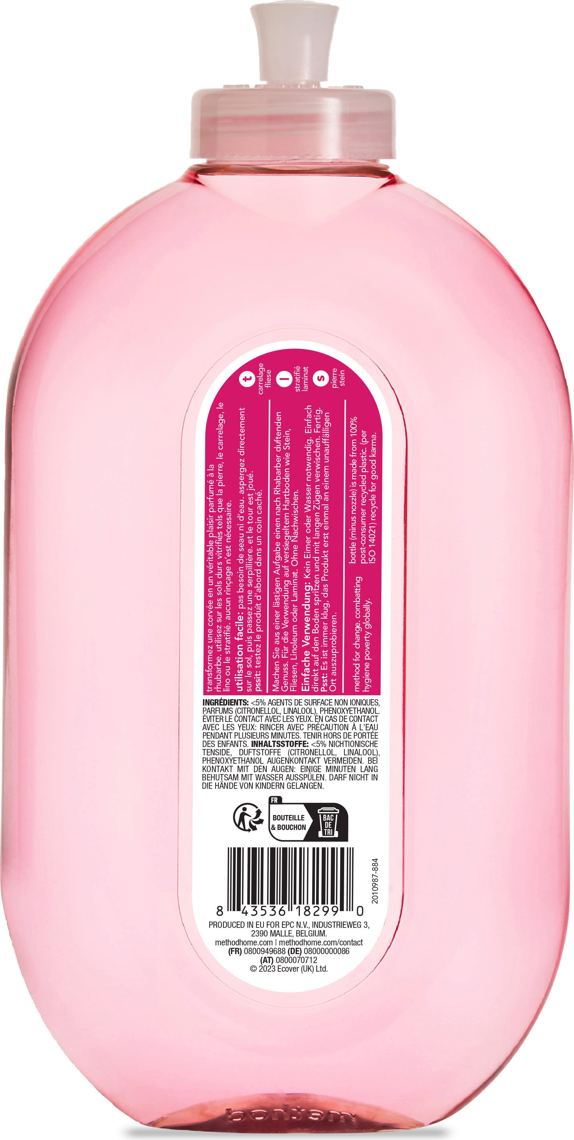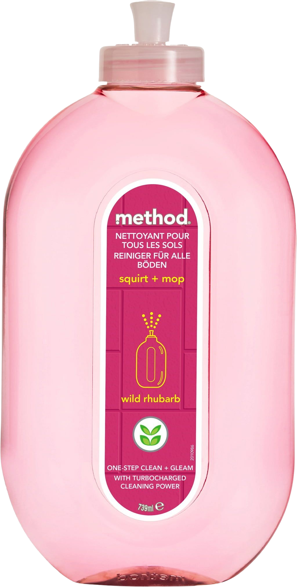 „Squirt + mop” to zasada działania tego środka do czyszczenia podłóg: gotowa do użycia mieszanka jest łatwa w użyciu i nie wymaga dodatkowej wody. Formuła nie zawiera wosku i nadaje się do twardych podłóg, takich jak kamień, płytki lub laminat. Dla błyszczących, czystych gleb o owocowym, kwaśnym zapachu rabarbaru.