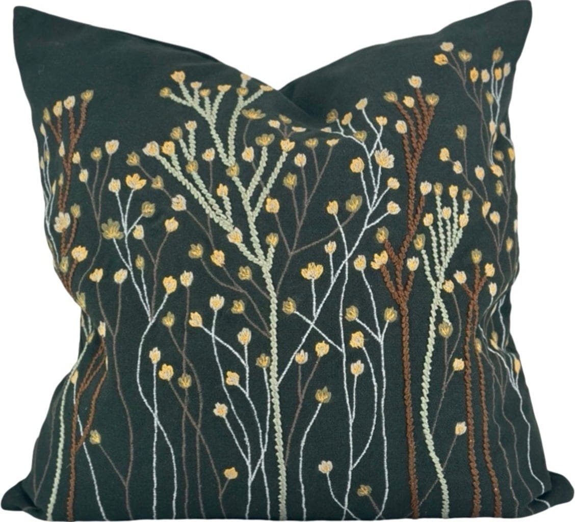 Poszewka na poduszkę "Paniculata Moss" nada Twojemu domowi naturalną, spokojną atmosferę. Ciemnozieloną bawełnianą tkaninę uzupełniają delikatne, haftowane pąki kwiatowe w ciepłych kolorach ziemi - przyciągają wzrok na sofie lub łóżku.