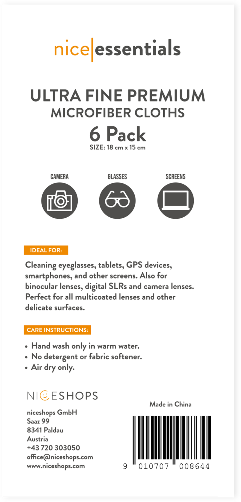 Ultracienkie ściereczki czyszczące z mikrofibry marki nice essentials są idealne do dokładnego, ale delikatnego czyszczenia delikatnych powierzchni, takich jak okulary, wyświetlacze lub obiektywy aparatów. Wysokiej jakości, ściśle tkany materiał z mikrofibry niezawodnie przyciąga kurz, brud i olej, usuwając irytujące odciski palców – bez pozostawiania zarysowań lub kłaczków.
