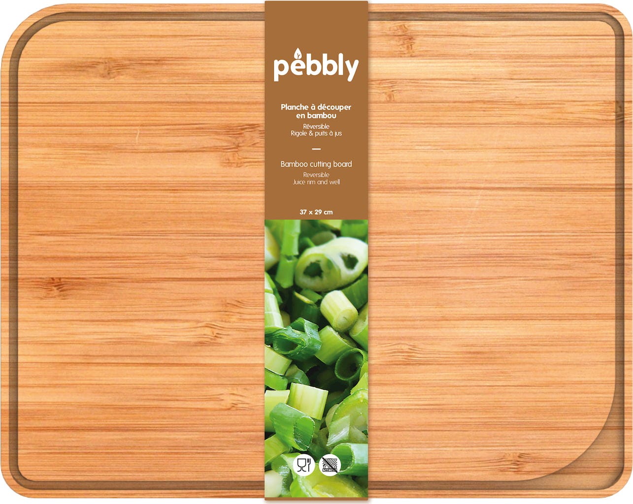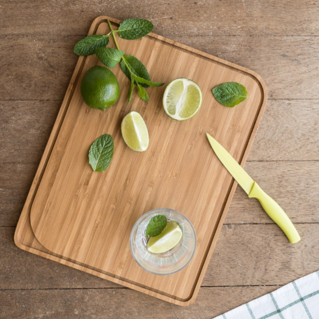 Ta praktyczna deska do krojenia wykonana jest w 100% z bambusa i ma dwie różne strony: Jedna jest gładka i idealnie nadaje się do serwowania lub krojenia suchej żywności. Druga strona ma rowek, dzięki czemu nadmiar soku jest zbierany podczas krojenia mięsa, ryb lub warzyw.