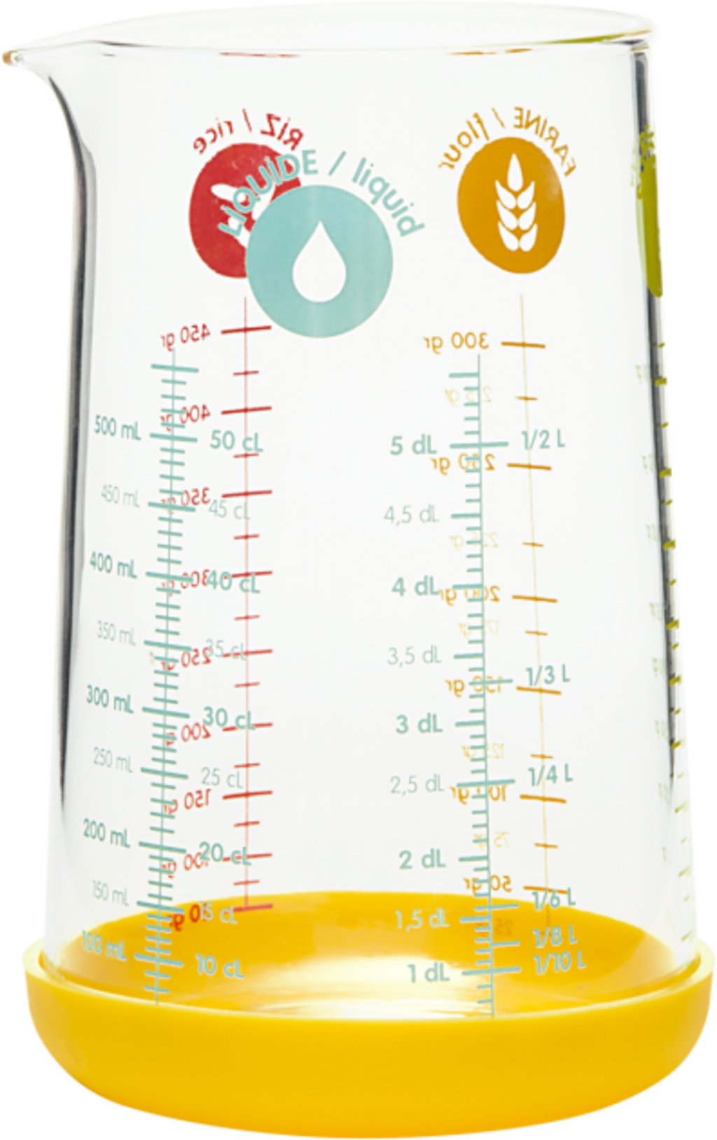Ta kolorowa miarka z odpornego na wysokie temperatury szkła borokrzemowego nie tylko ładnie wygląda, ale jest również bardzo praktyczna. Dzięki swojej widocznej i kolorowej skali pomiar jest łatwy do odczynia ilości: płynów, mąki, cukru, ryżu i innych. Zdejmowane, silikonowe dno gwarantuje stabilność. Wspaniała pomoc kuchenna, której nie może zabraknąć w żadnej kuchni.