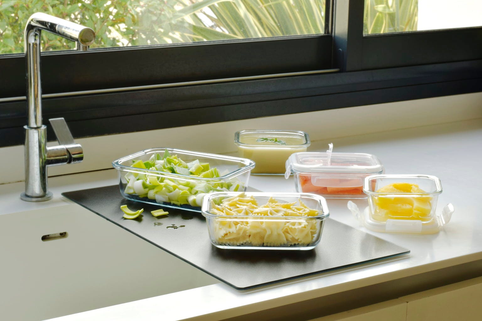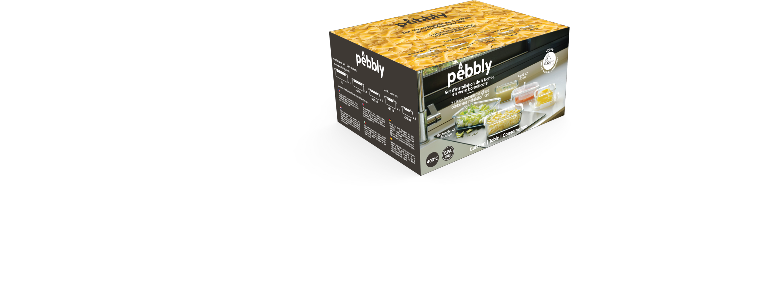 Pojemniki wykonane są z wytrzymałego szkła borokrzemowego, a pokrywki z tworzywa sztucznego. Dzięki silikonowej uszczelce pojemniki można szczelnie zamknąć, dzięki czemu żywność zachowuje swój smak i dłużej się przechowuje.