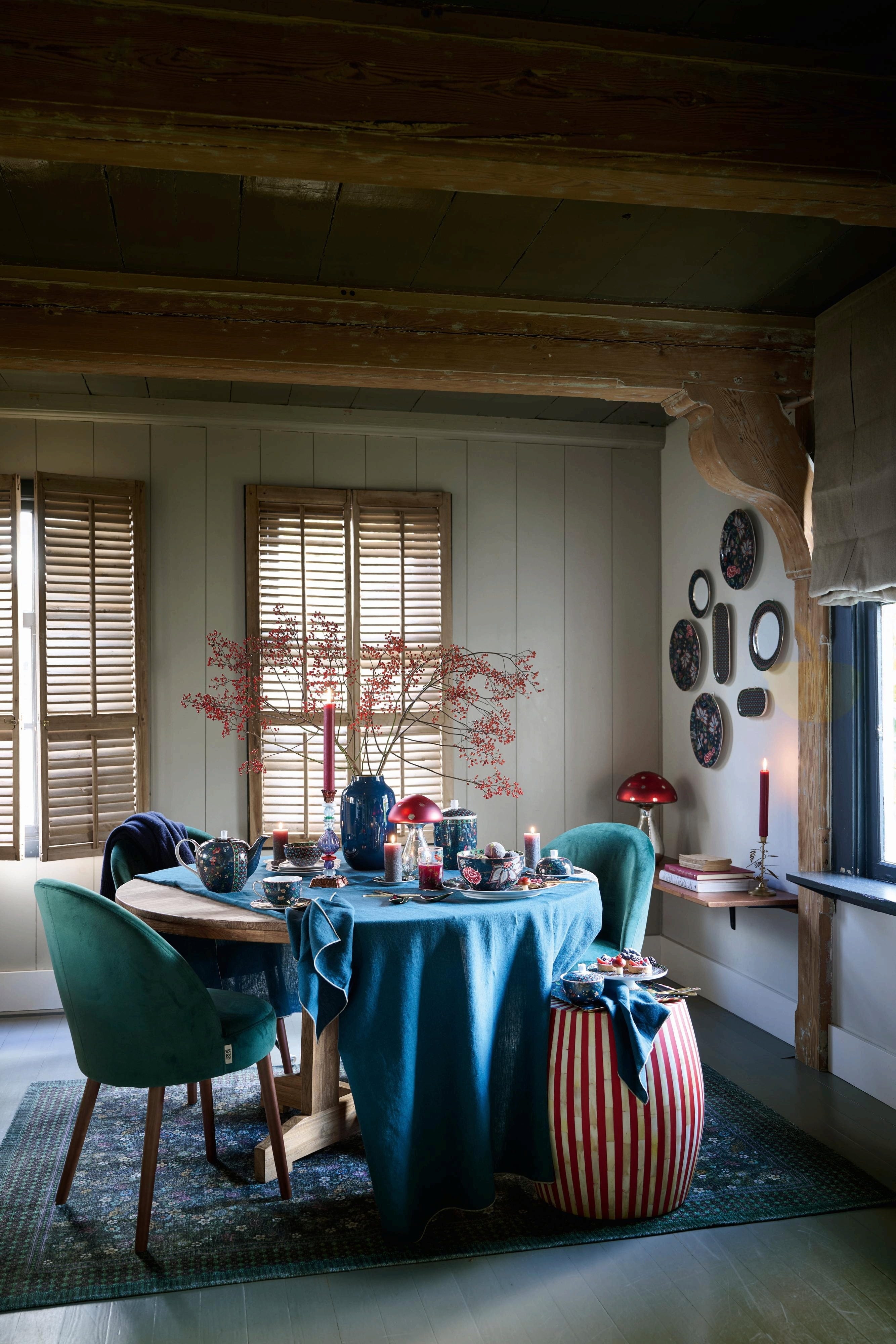 Pokrywka naczynia nawiązuje do różnorodności wzornictwa, prezentując wyrazisty, geometryczny motyw kwiatowy w odcieniach turkusu i rdzawej czerwieni na ciemnym tle. Delikatny pasek w kolorze czerwonym i białym otacza krawędź naczynia, harmonijnie łącząc różne wzory. Biały, smukły uchwyt pokrywki zapewnia eleganckie wykończenie. Dzięki pojemności 300 ml ta porcelanowa cukiernica jest idealna na cukier lub słodycze!