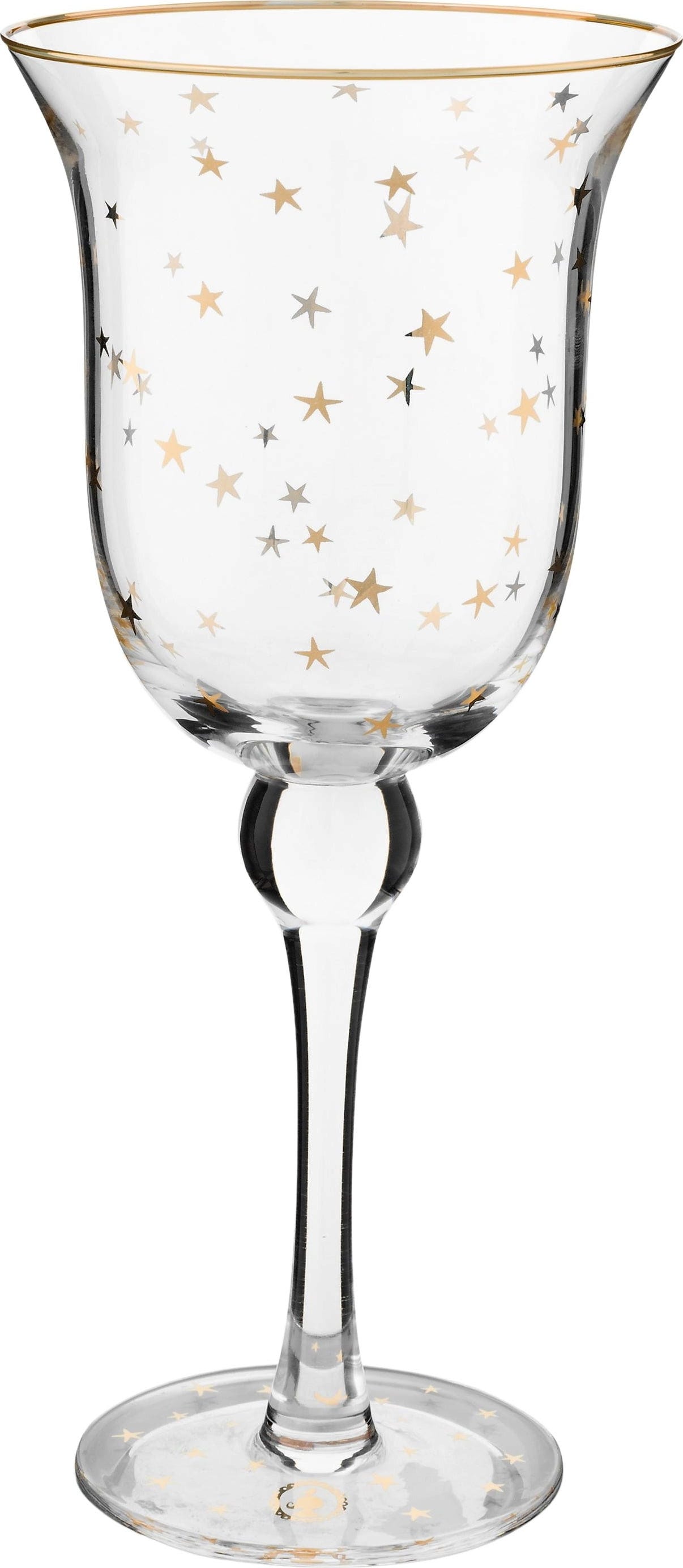 Niech Twoje napoje zalśnią w wielkim stylu dzięki temu pięknemu kieliszkowi do wina od Pip Studio! Kieliszek został wykonany z przezroczystego, wysokiej jakości szkła i ozdobiony delikatnymi gwiazdkami w kolorze złotym i srebrnym. Cienka, złota krawędź stanowi luksusowy akcent. Wytworna nóżka z zgrubieniem w kształcie perły sprawia, że kieliszek przyciąga wzrok. Ponadto posiada on dużą pojemność 390 ml.