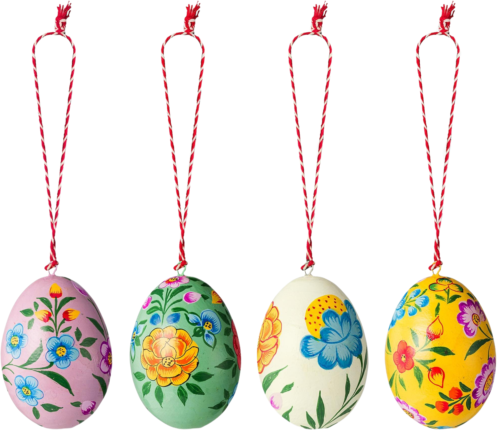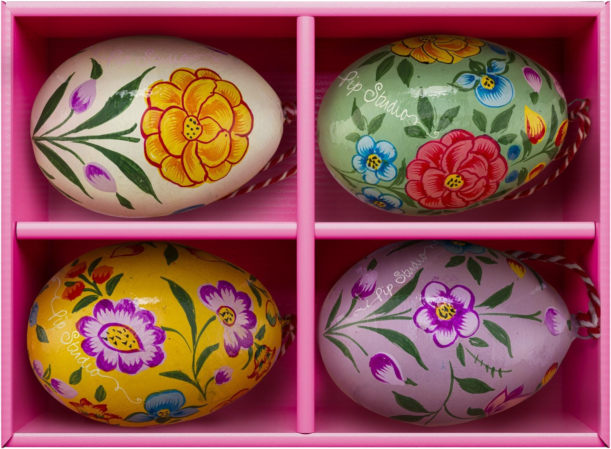 Ten czteroczęściowy zestaw pisanek od Pip Studio natychmiast wprawi Cię w dobry nastrój! Dzięki ręcznie malowanym, kolorowym wzorom, lekkie jajka z papier-mâché są małymi dziełami sztuki, które emanują nostalgicznym urokiem i nowoczesną elegancją. Ponieważ są lekkie jak piórko, idealnie nadają się do powieszenia na wiosennych gałęziach bez obciążania ich, ale także doskonale prezentują się jako odrobina koloru w misce.