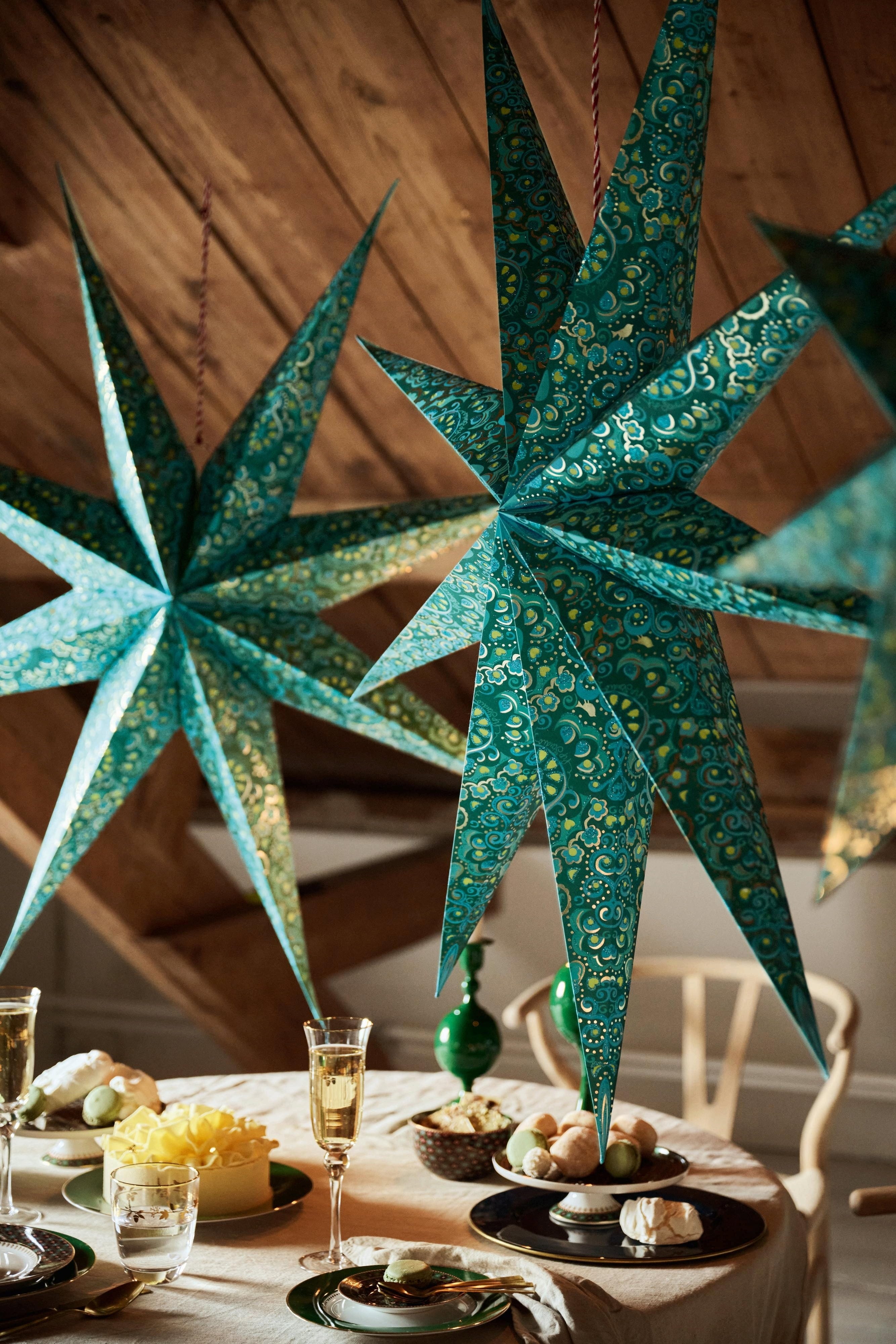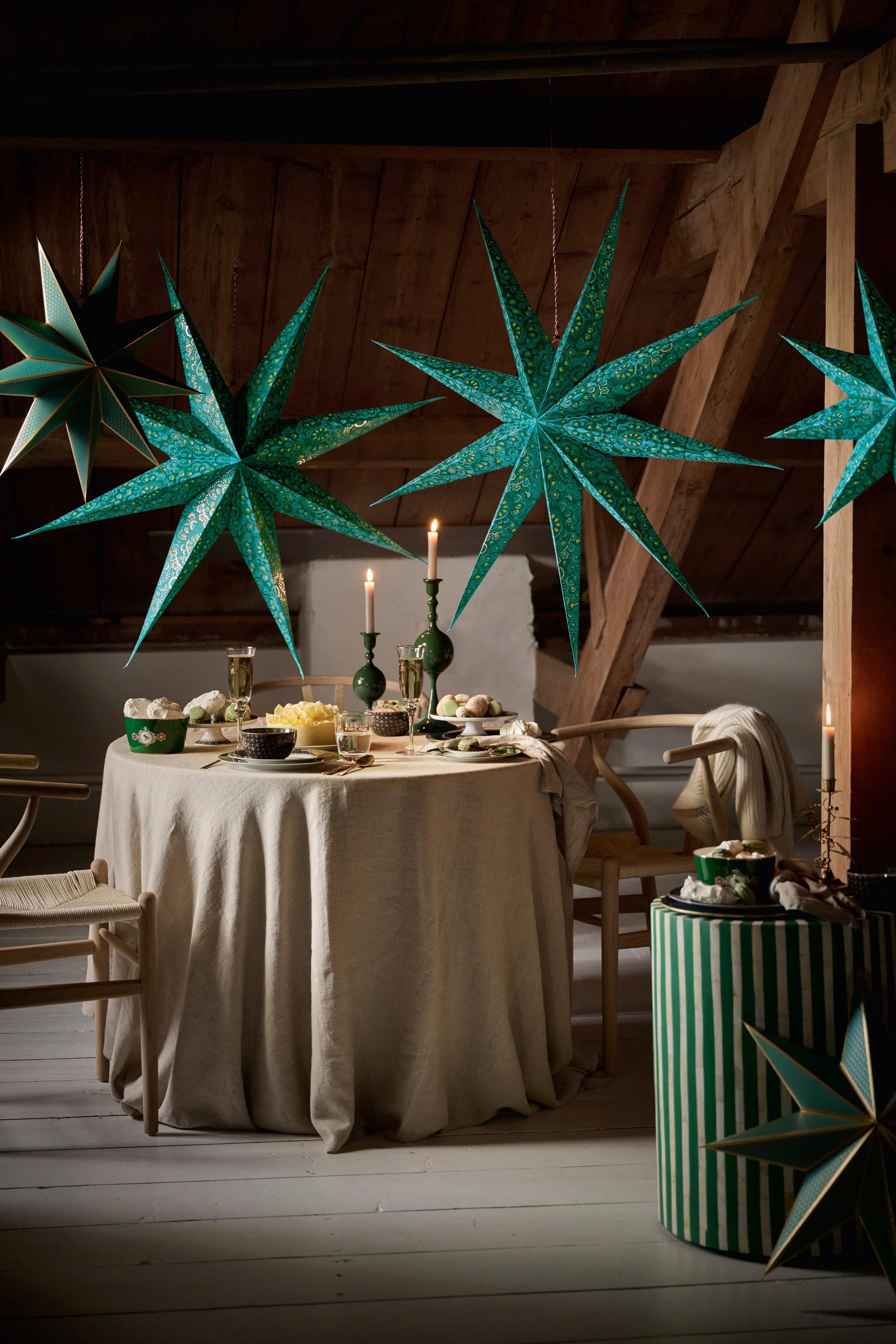 Zachwyca swoim eleganckim, a zarazem filigranowym designem, którego podstawą jest elegancki, głęboki odcień zieleni. Misternie wykonane wzory w kolorze żółtym i jaśniejszej zieleni nadają projektowi świąteczny charakter. Starannie złożone, ostre ramiona nadają gwieździe imponującą trójwymiarową głębię i pełną wdzięku formę.