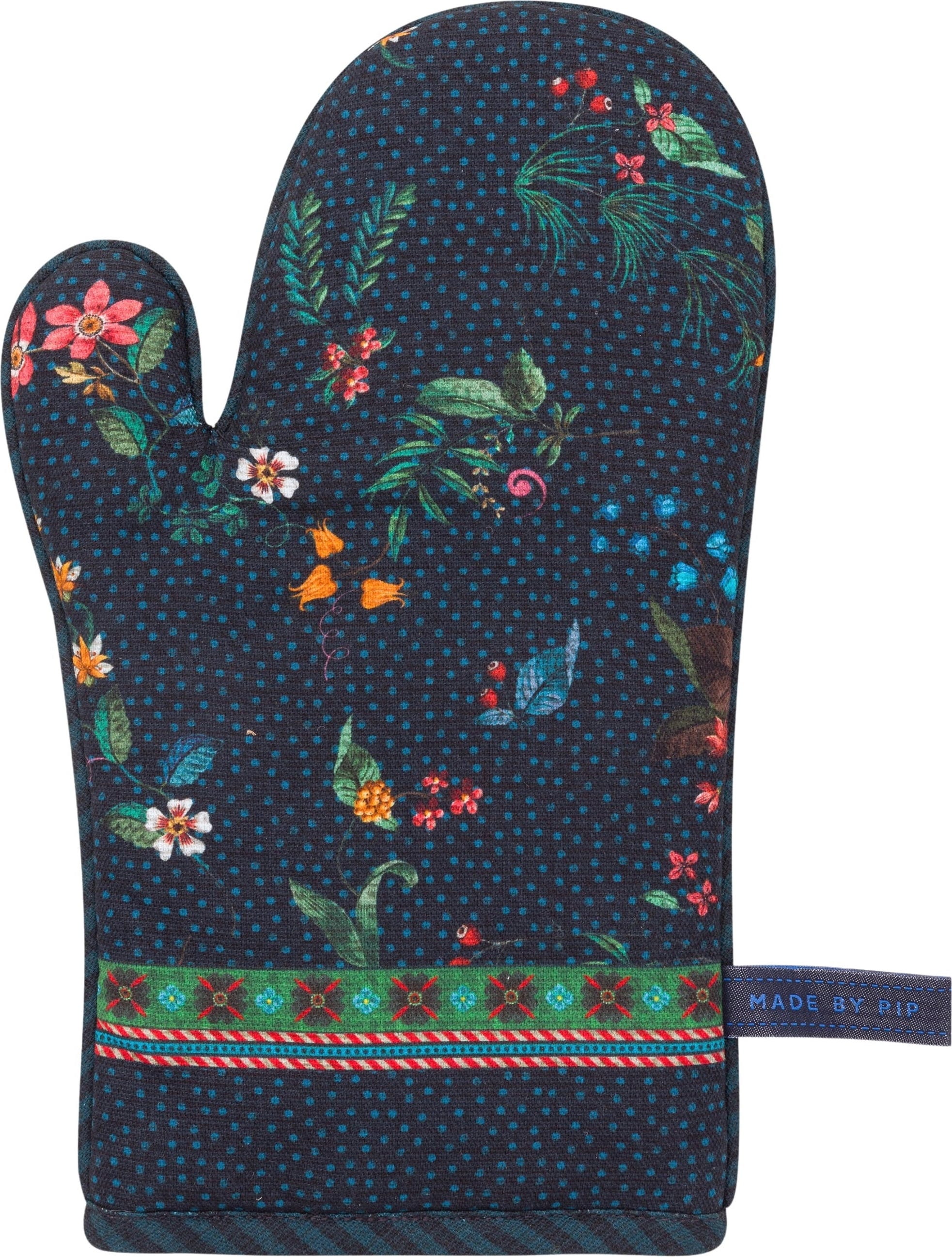 Chroń swoje dłonie podczas gotowania i pieczenia dzięki tej przepięknej rękawicy kuchennej od Pip Studio! Rękawica zachwyca bogatym w detale designem: granatowa powierzchnia główna pokryta jest żywym wzorem kwiatów, jagód i liści w jaskrawych kolorach. Dolny mankiet prezentuje wyrazisty, geometryczny wzór kwiatowy i kratkę.