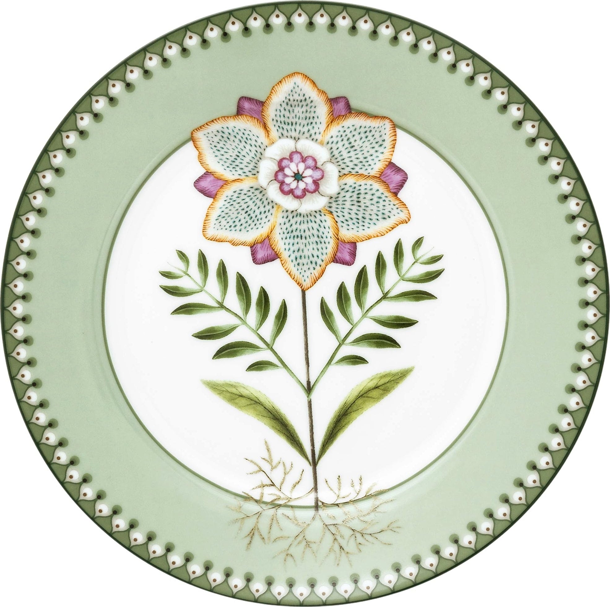 Odkryj ten czarujący talerz śniadaniowy lub deserowy z kolekcji Lily & Lotus marki Pip Studio! Został on ozdobiony wspaniałym, fantazyjnym motywem lilii w delikatnych pastelowych odcieniach, który króluje w centrum talerza. Bogaty w detale kwiat i jego pełne wdzięku formy są rozmieszczone symetrycznie, nadając talerzowi nowoczesny, a zarazem ponadczasowy charakter. Subtelnie wzorzysty brzeg harmonijnie dopełnia design i podkreśla elegancję talerza.