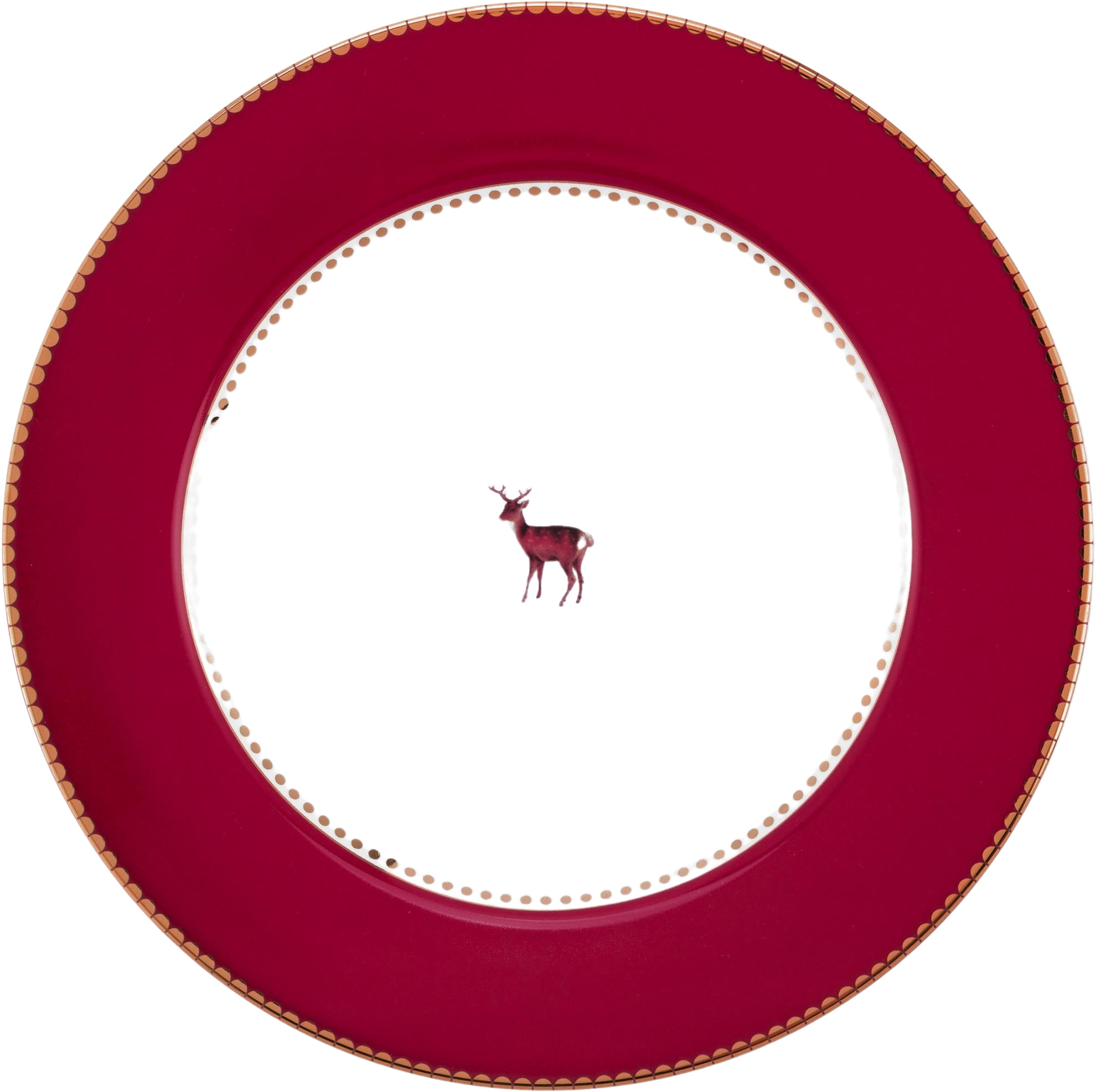 Dzięki tym uroczym talerzom od Pip Studio zadbasz o wspaniale nakryty stół! Głęboka czerwona krawędź i złote detale otaczają słodkiego jelenia w środku, tworząc design zarówno elegancki, jak i uroczy. Wykonany z delikatnej porcelany, ten fantazyjnie zaprojektowany talerz przyciąga wzrok na każdym stole – to prawdziwy hit, szczególnie w okresie świątecznym!
