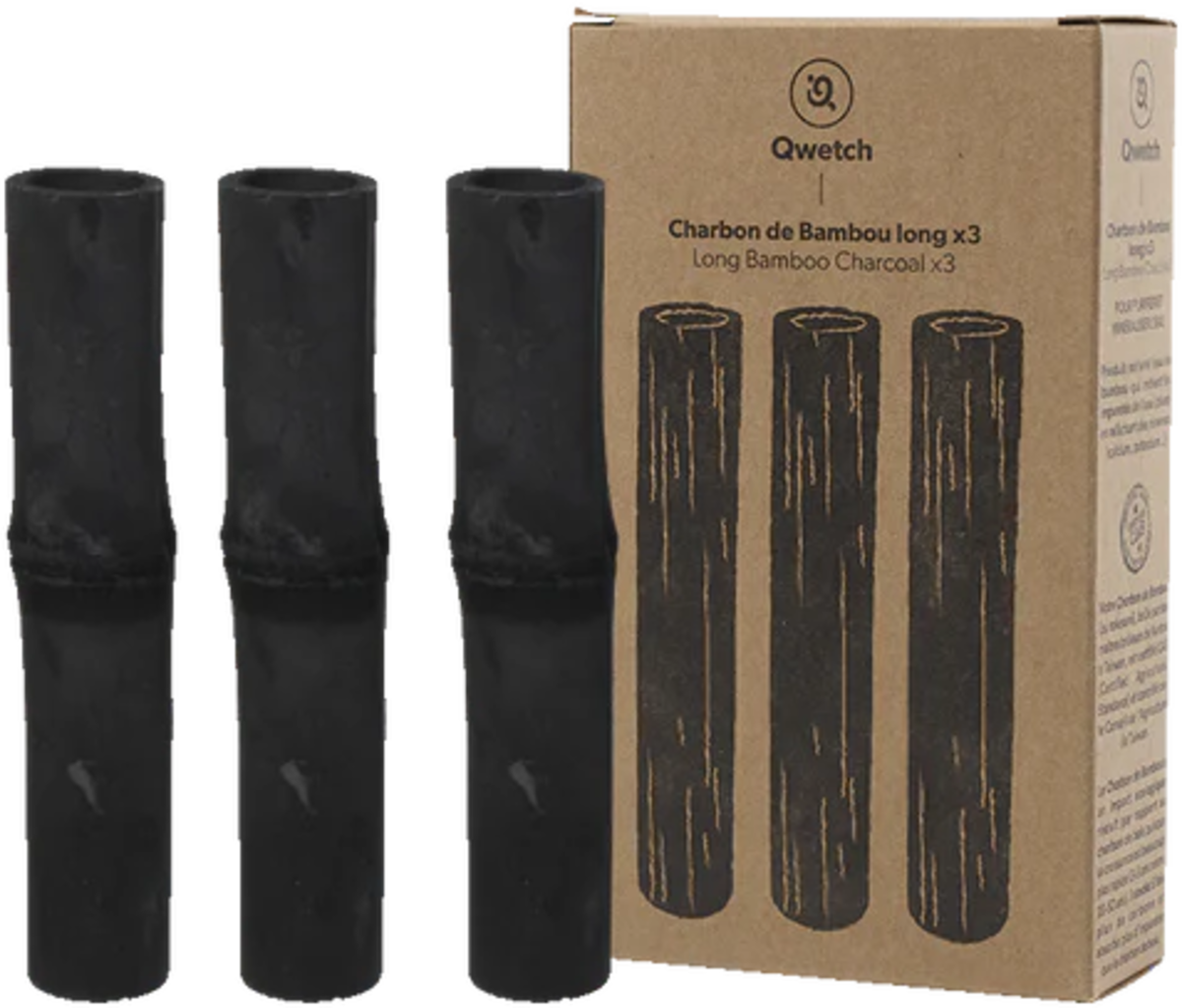 Węgiel bambusowy firmy Qwetch oczyszcza i mineralizuje wodę. Pręt węglowy zatrzymuje zanieczyszczenia (zwłaszcza chlor) uwalniając między innymi magnez, wapń i potas. Jeśli chodzi o węgiel drzewny bambusowy, firma Qwetch kładzie szczególny nacisk na pochodzenie, unikanie obróbki chemicznej i dobre warunki wzrostu.
