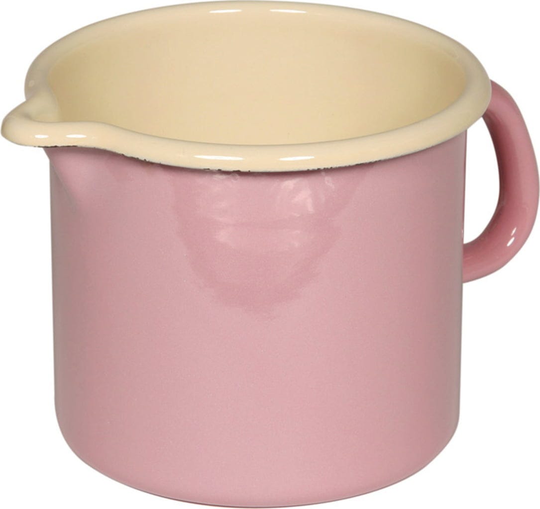Praktyczny kubek z dzióbkiem z zewnątrz w ślicznym, różowym kolorze. a w środku biały. Garnuszek służy nie tylko do gotowania mleka, ale także do szybkiego podgrzewania. Emaliowany garnuszek nie chłonie aromatów i nie zmienia smaku potraw.