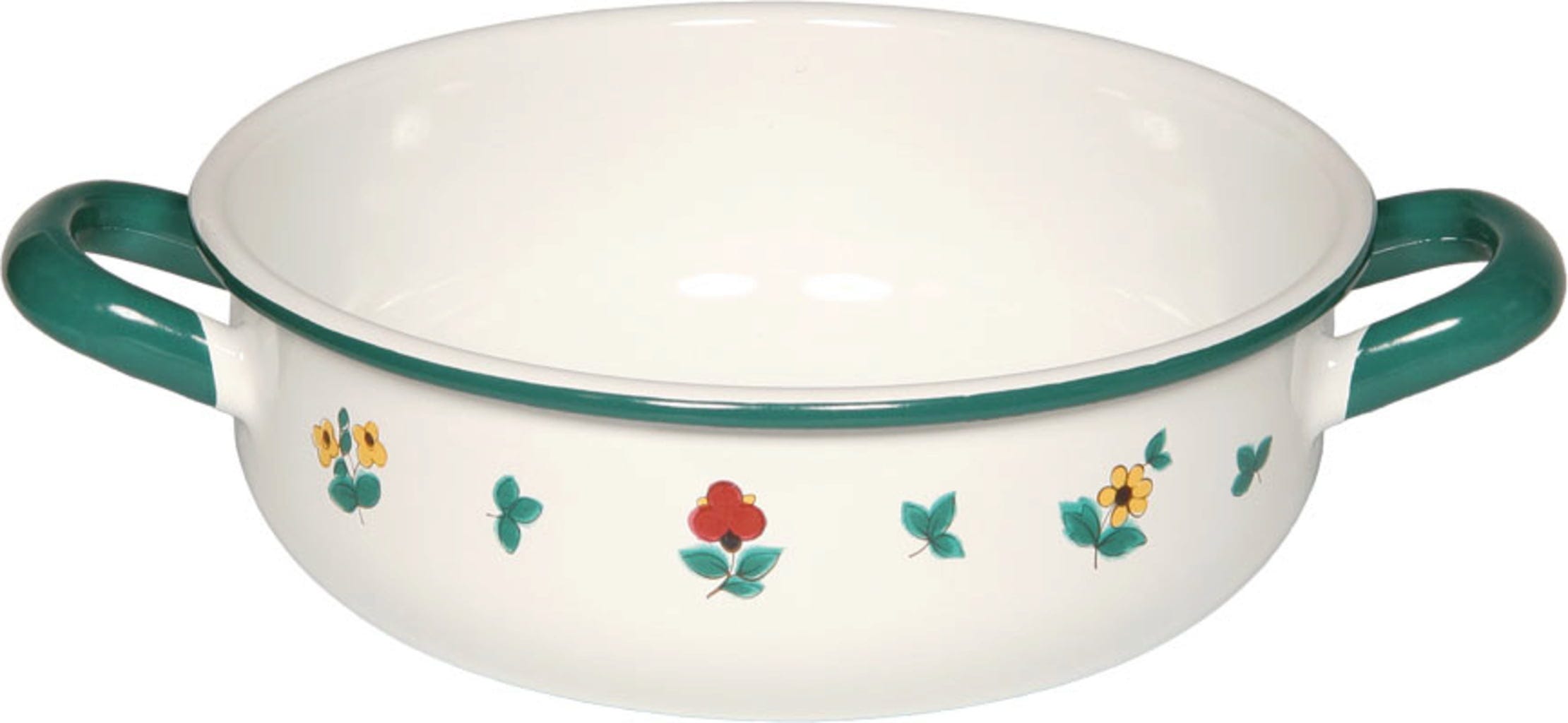 Tradycyjna ceramika Gmundner z kolorowymi kwiatami. Miska świetnie wygląda w kuchni! Naczynie jest wyposażone w dwa uchwyty, które ułatwiają pracę w kuchni, ułatwiając obsługę i przechowywanie w kuchni - od mieszkania studenckiego po dom na wsi! Miska RIESS jest pięknie wykonana w jedynej emaliowej manufakturze w Austrii.
