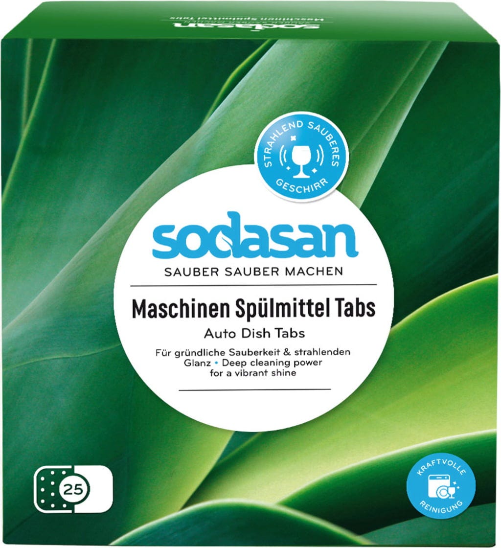 Tabletki do zmywarki firmy Sodasan nadają się do stosowania we wszystkich zmywarkach domowych. Ten produkt zawiera wyłącznie roślinne substancje myjące. Cytrynian i poliasparaginiany służą jako zmiękczacze i zastępują fosforany.