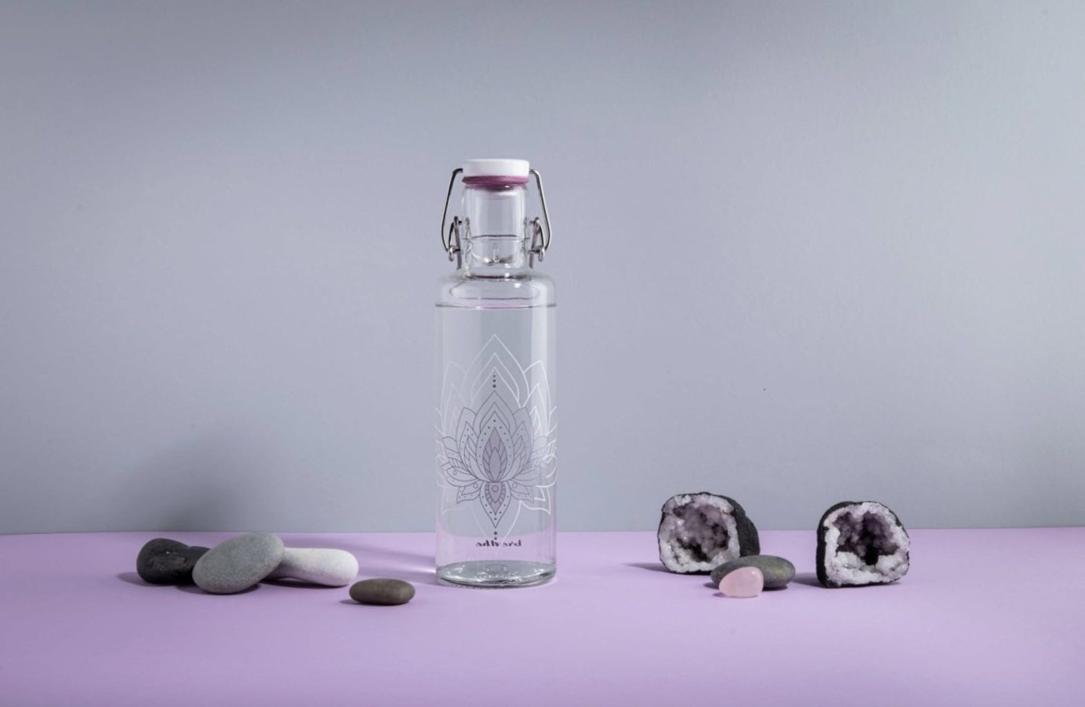 Dzięki tej szklanej butelce do picia zagwarantowana jest czysta przyjemność picia. Nadruk kwiatu lotosu zapewnia również duchowość, czystość i oświecenie. Na chwile odpoczynku pomiędzy.