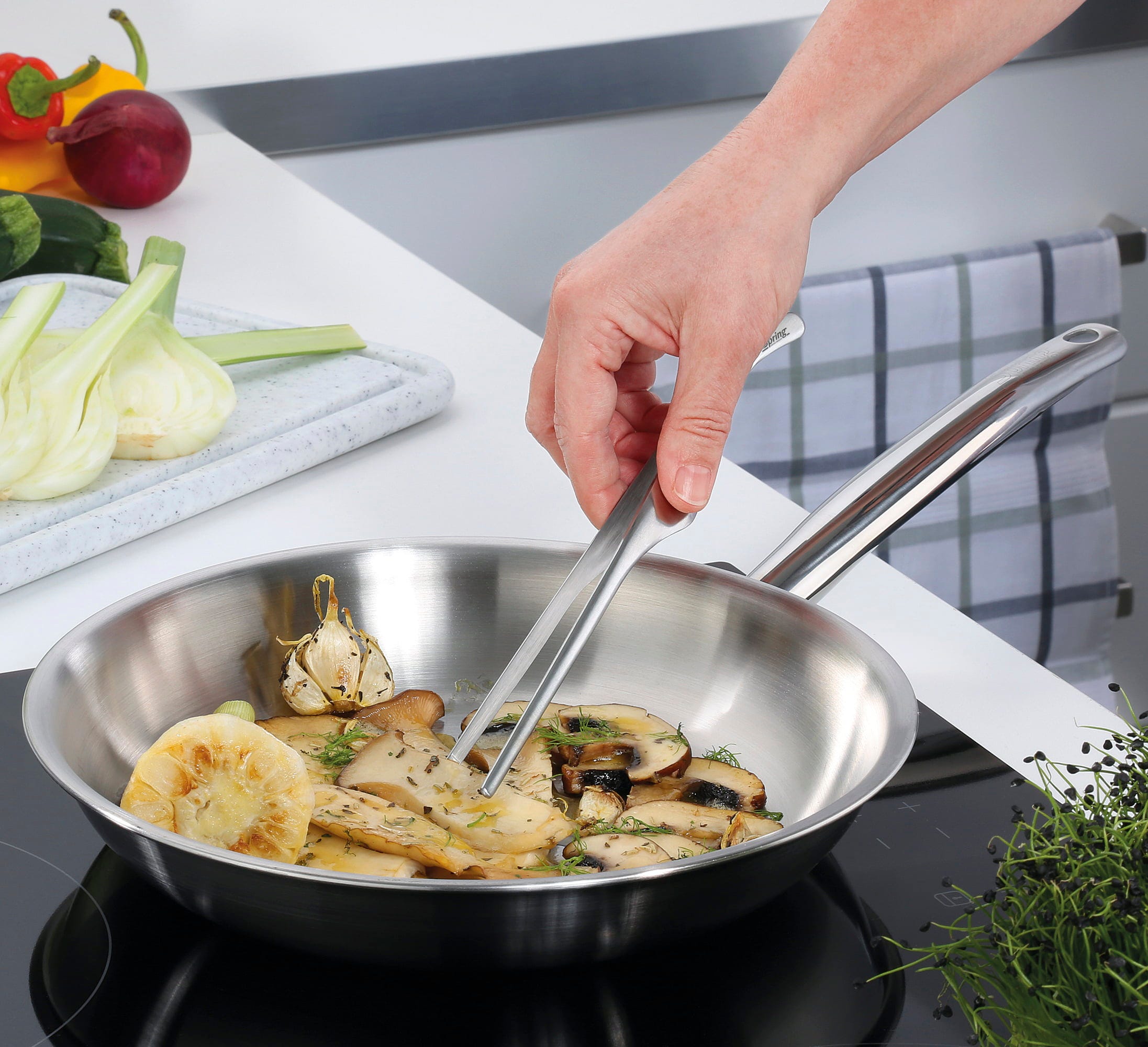 Dzięki serii Brigade Premium marki Spring wprowadzisz do swojej kuchni prawdziwą jakość gastronomiczną! Wysoko przewodzący 5-warstwowy materiał wielowarstwowy natychmiast przekazuje ciepło z dna na ścianki boczne, dzięki czemu potrawy są równomiernie i energooszczędnie otaczane temperaturą z każdej strony. Dzięki ergonomicznym uchwytom ze stali nierdzewnej zachowujesz pełną kontrolę w każdej chwili.
