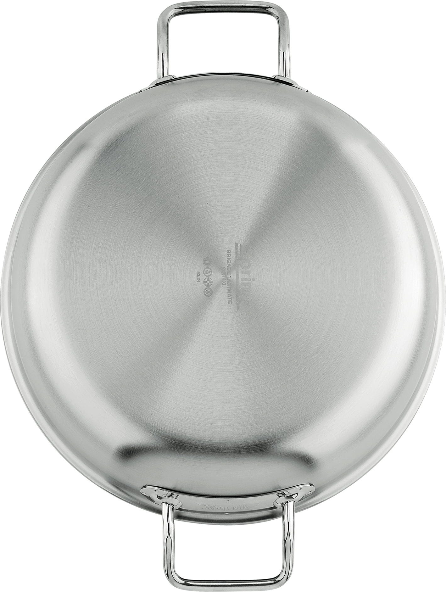Dzięki patelni do serwowania Brigade Ultimate marki Spring wzniesiesz swoje kulinarne umiejętności na zupełnie nowy poziom! Tajemnica jej wyjątkowej wydajności tkwi w sprawdzonym 5-warstwowym materiale wielowarstwowym: potrójny rdzeń aluminiowy sprawia, że ciepło jest rozprowadzane błyskawicznie i absolutnie równomiernie, podczas gdy solidna powierzchnia ze stali nierdzewnej przekonuje naturalnym efektem antyadhezyjnym.