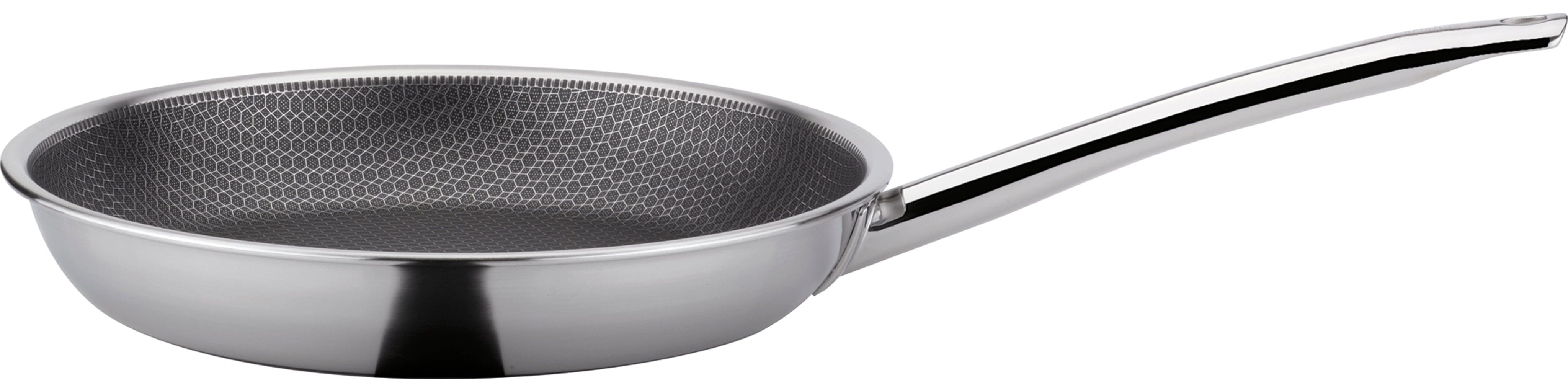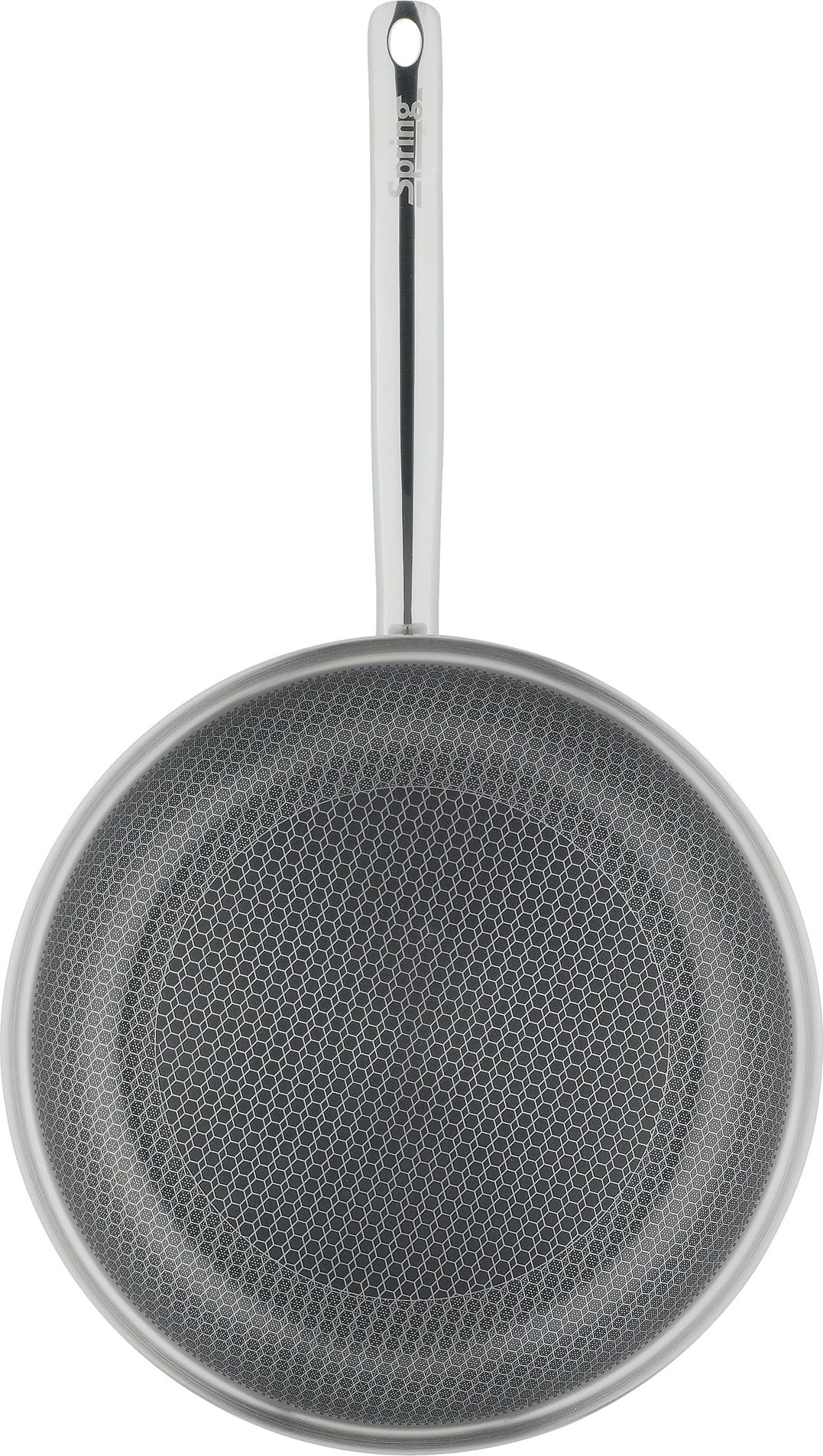 Patelnia Vulcano Cut Resist Pure marki Spring to idealny wybór dla każdego, kto nie idzie na kompromisy w kuchni! Jej główną zaletą jest innowacyjna, wypukła struktura plastra miodu wykonana ze stali nierdzewnej. Chroni ona mineralną powłokę nieprzywierającą tak skutecznie, że bez obaw można używać metalowych szpatułek.