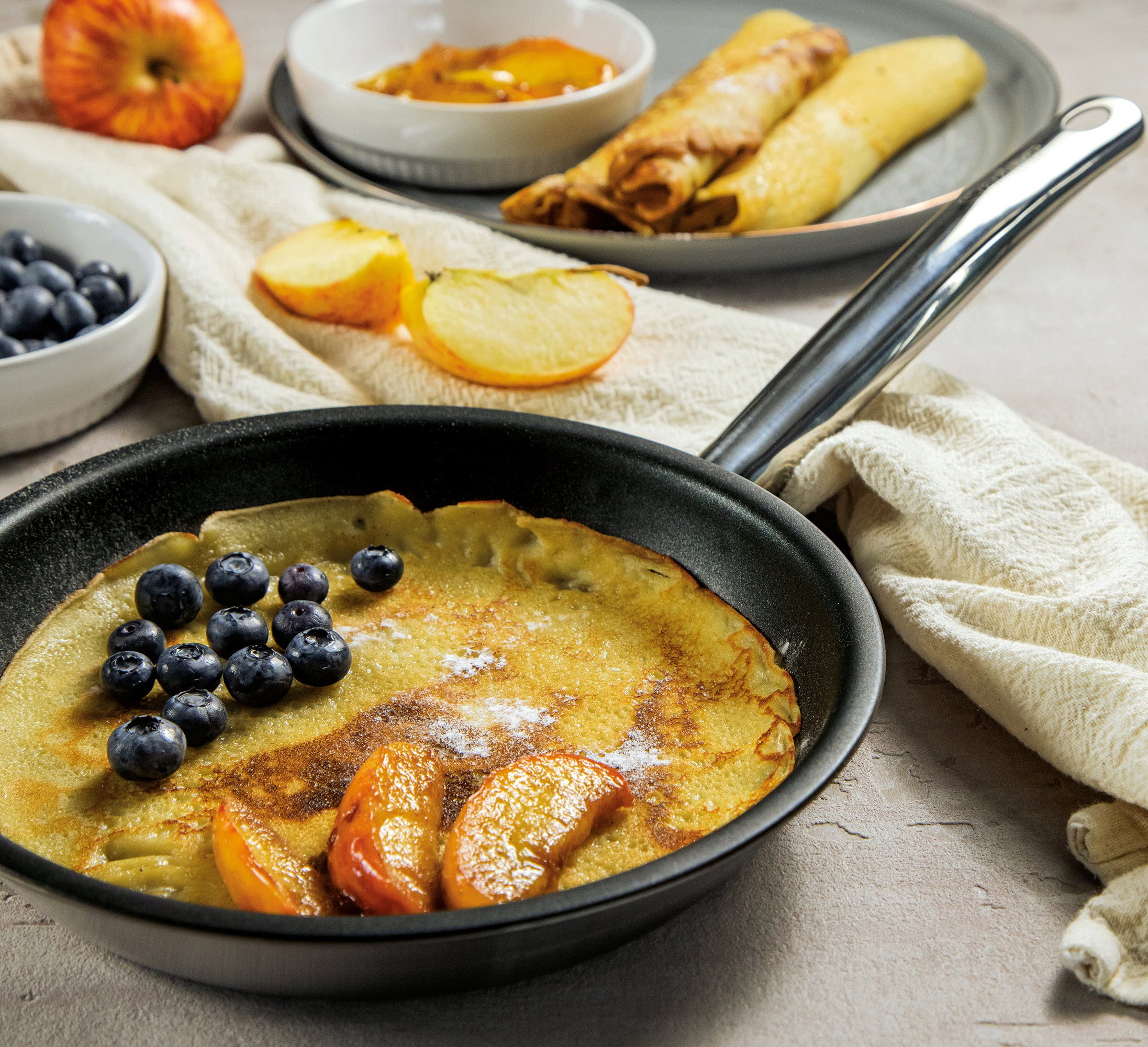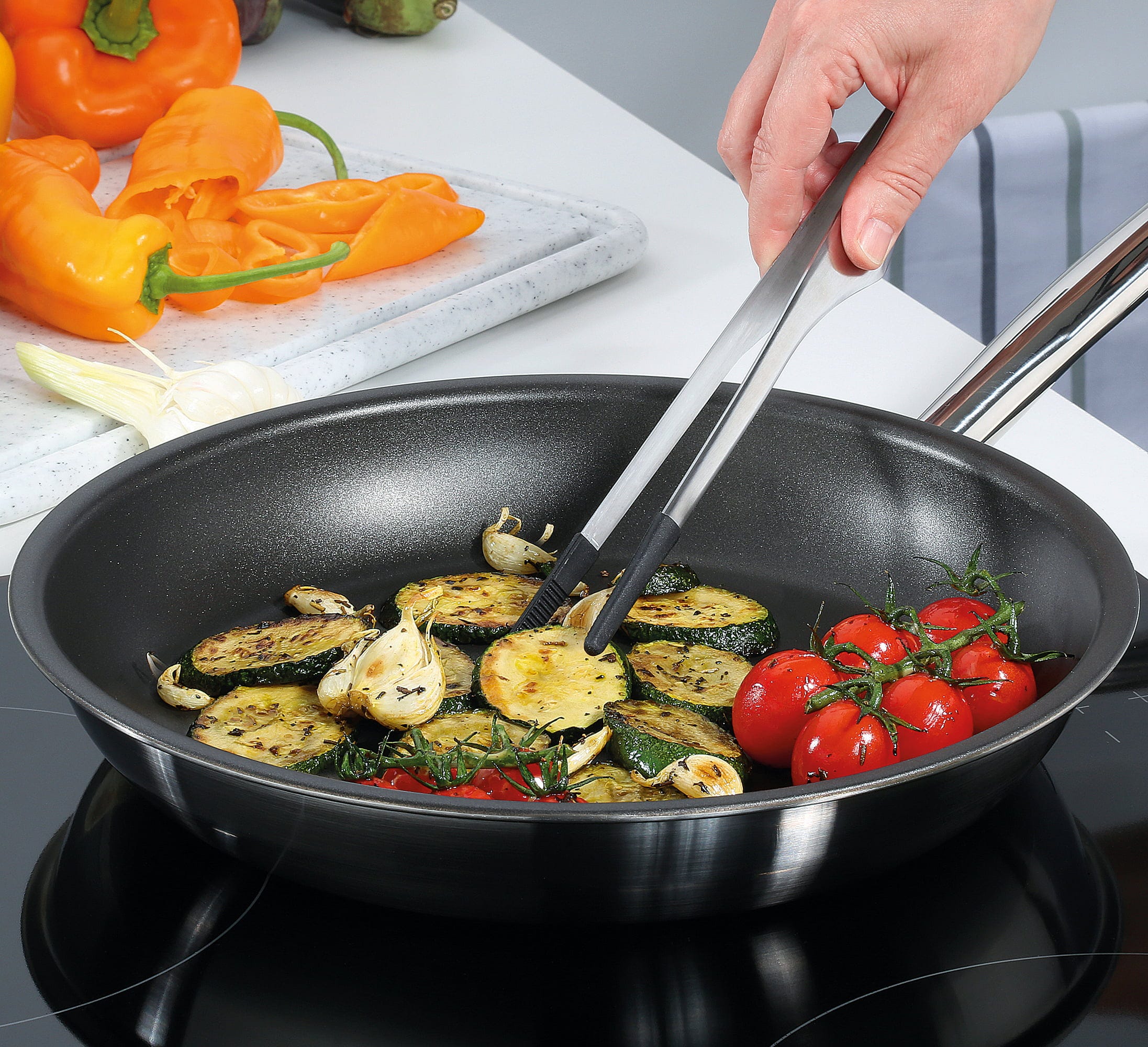 - Wysokiej jakości 5-warstwowy materiał wielowarstwowy: zapewnia ekstremalnie szybkie i równomierne rozprowadzanie ciepła aż po krawędź patelni