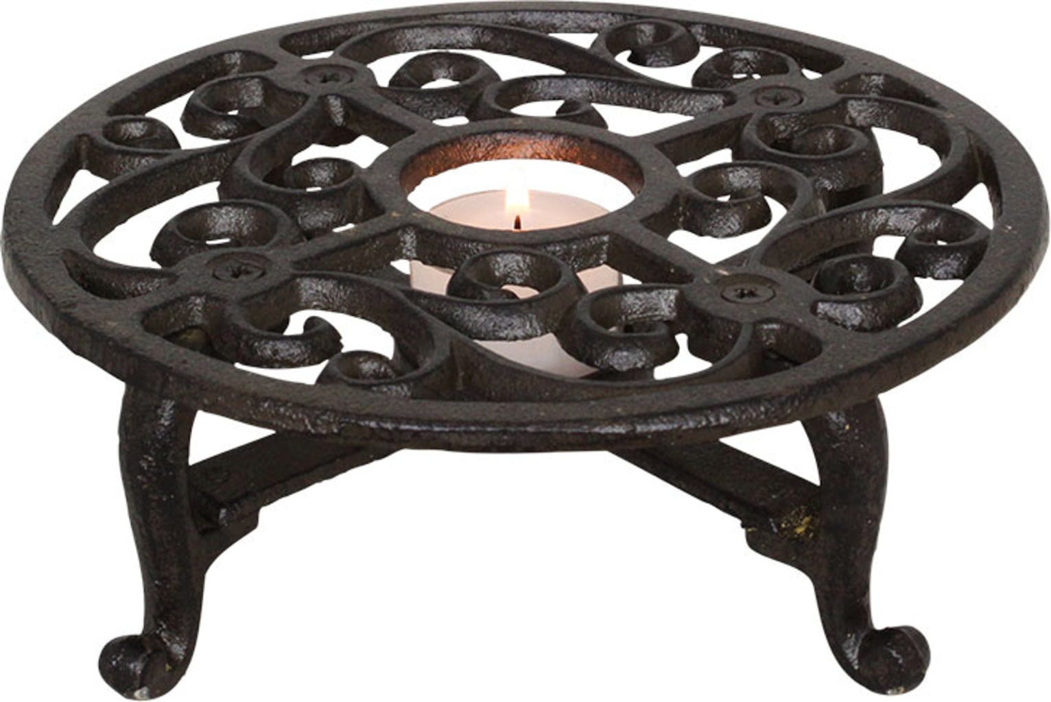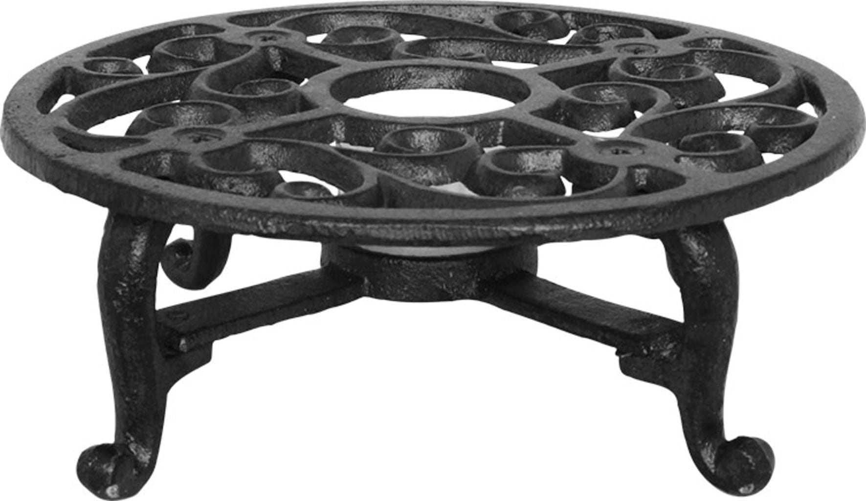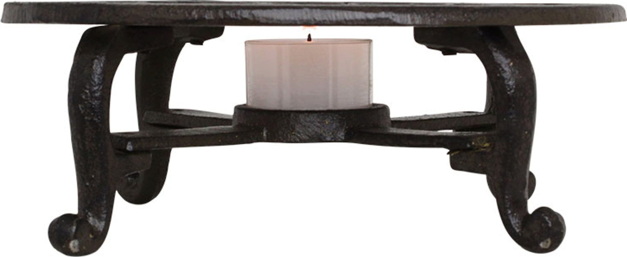 Ta rustykalna podstawka wykonana z wytrzymałego żeliwa została zaprojektowana tak, aby utrzymywać ciepło napojów i żywności przez dłuższy czas. W środku znajduje się wgłębienie, które zapewnia miejsce na świeczkę typu tealight. Naczynia żaroodporne, takie jak garnki lub czajniki, mogą być również dekoracyjnie prezentowane za pomocą tej podstawki.