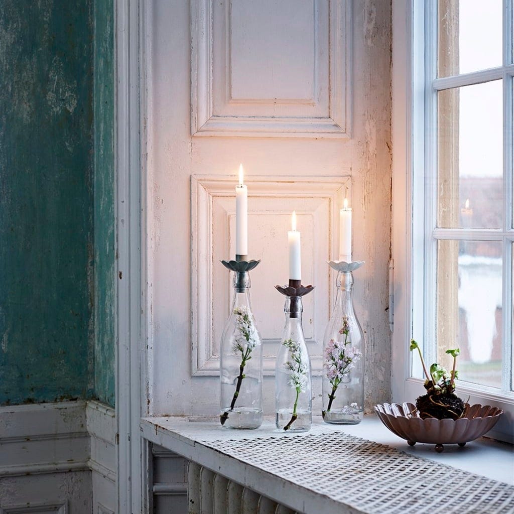 Ten nowoczesny świecznik umieszczany jest po prostu na pustej butelce i w ten sposób tworzy wyjątkowy nastrój w każdym pomieszczeniu. Pojemnik w kształcie kwiatka został ręcznie pomalowany i zapobiega uszkodzeniom spowodowanym gorącym woskiem ze świecy.