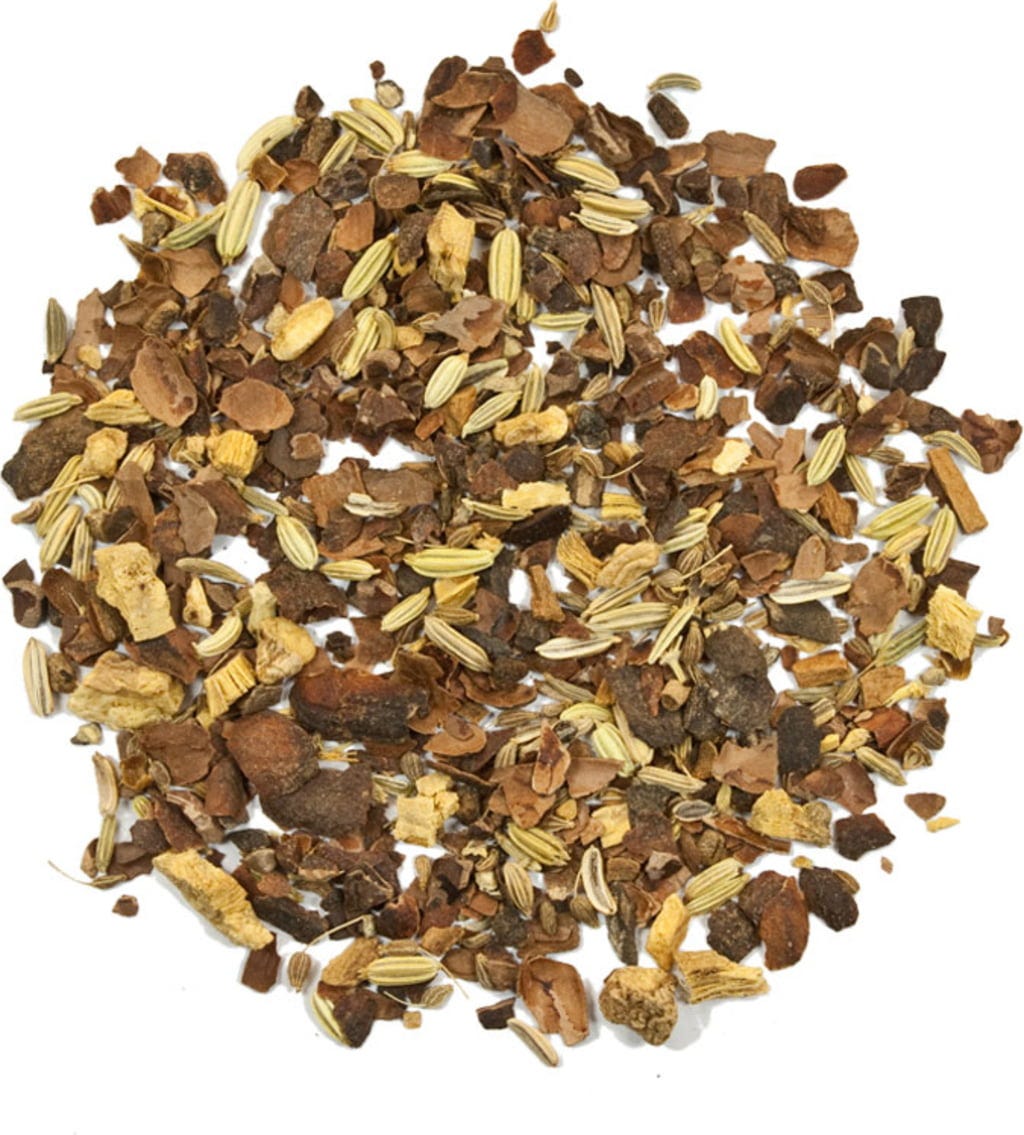 łupiny kakaowe, imbir, koper, nasiona anyżu, cynamon, kardamon, pieprz, goździki, lukrecja