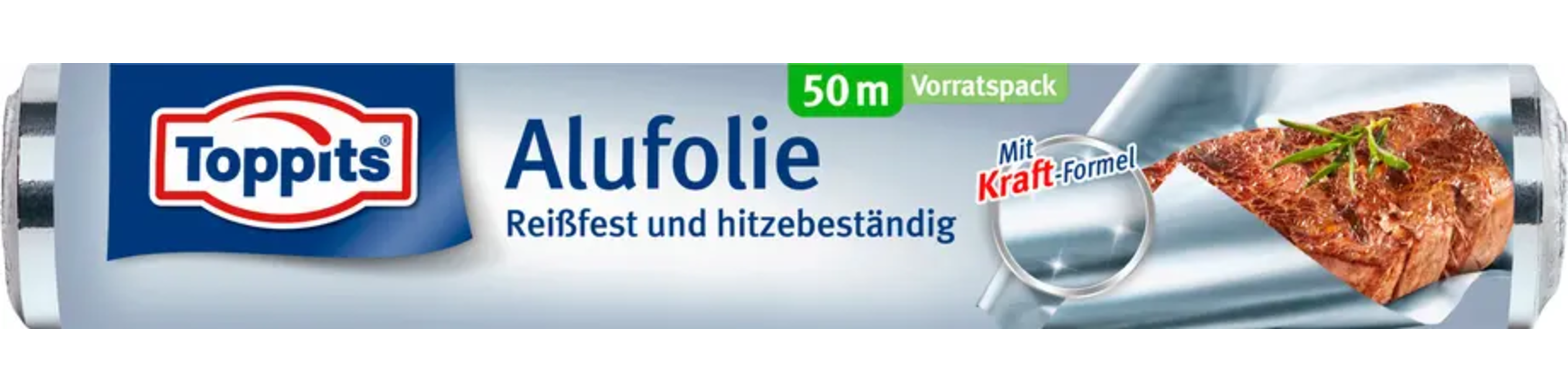 Folia aluminiowa Toppits to praktyczny pomocnik w wielu sytuacjach w kuchni i podczas grillowania: łatwo się rozrywa, a dzięki specjalnej formule pozostaje stabilna i odporna na rozdarcia. Jej odporność na ciepło sprawia, że nadaje się nie tylko do przykrywania i pakowania żywności, ale także do pieczenia, grillowania czy przygotowywania potraw w piekarniku. Dzięki swojej wytrzymałości oferuje wszechstronne rozwiązanie do codziennych kuchennych potrzeb.