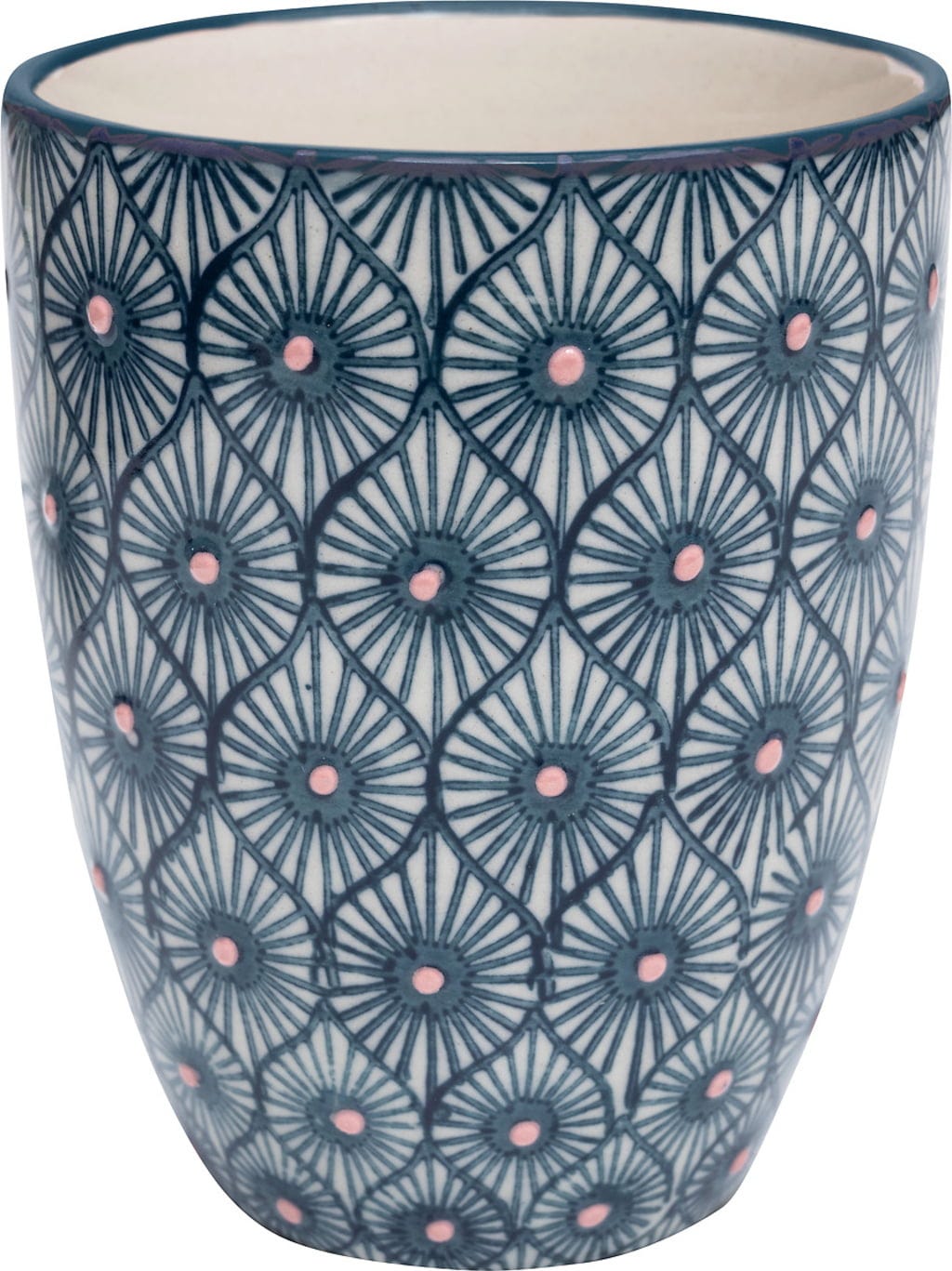Kubek z linii Mix'n'Match jest wyjątkowo oryginalny, a zarazem harmonijny. Jego wzór został naniesiony ręcznie za pomocą stempli, co przyciąga wzrok. Nadaje się zarówno do gorących, jak i zimnych napojów i można go łączyć z innymi elementami zastawy.