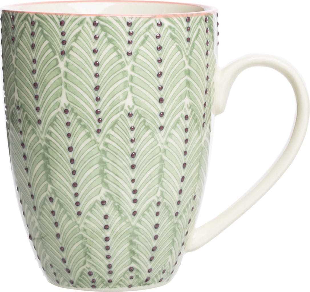 Ten przepiękny kubek zachwyca ręcznie stemplowanym wzorem oraz świeżą, radosną zielenią! Dzięki dużej pojemności idealnie nadaje się do porannej kawy lub herbaty, a po użyciu można go bez problemu umyć w zmywarce.