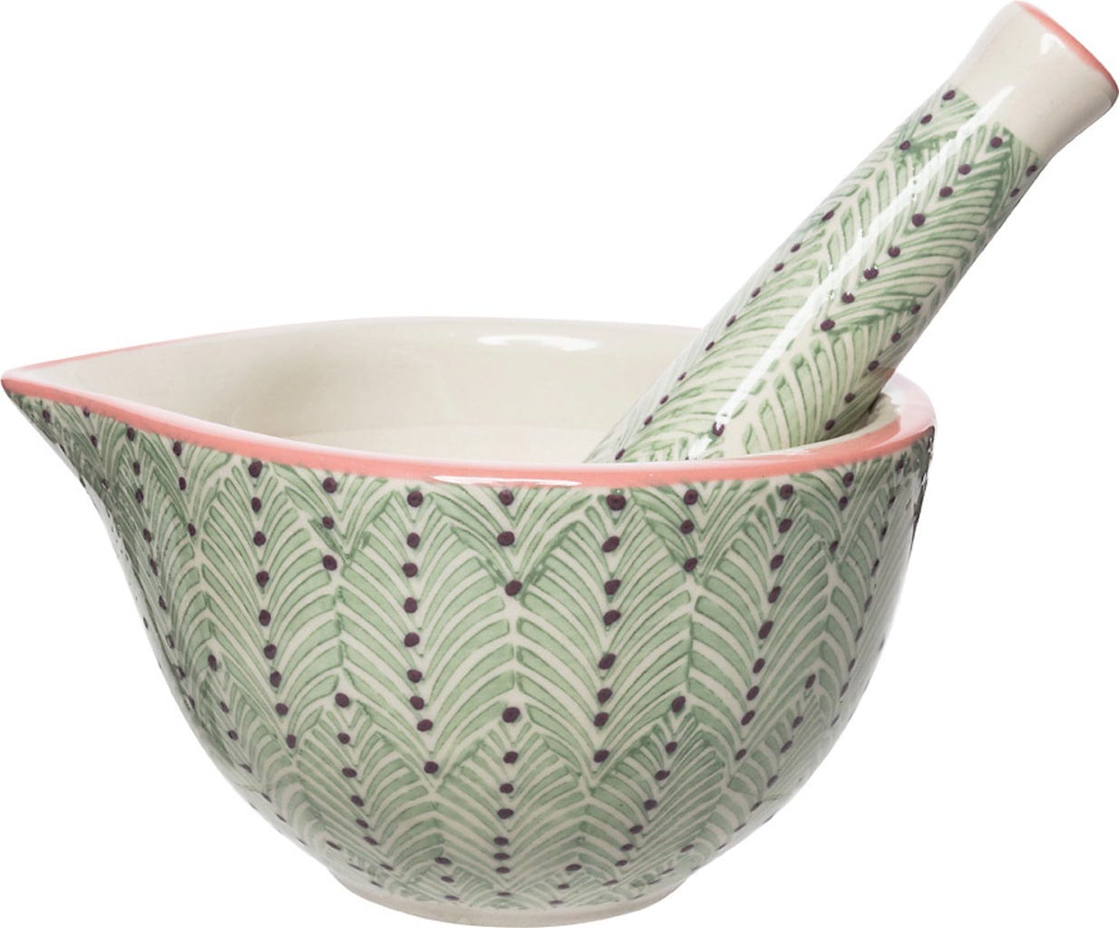 Moździerz Mix'n'Match to nie tylko praktyczny pomocnik przy rozdrabnianiu przypraw, orzechów czy przygotowywaniu pesto, ale także kolorowy element przyciągający wzrok w kuchni. Wykonany jest z ręcznie stemplowanej kamionki, a jego filigranowy, piękny design można łączyć z innymi produktami z tej linii.