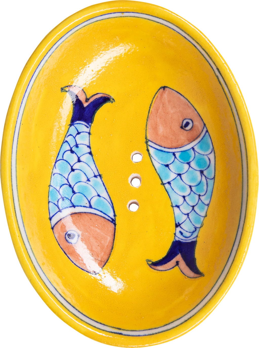 Kupując tę mydelniczkę, nie tylko wybierasz ładny, kolorowy dodatek do łazienki, ale jednocześnie wspierasz tradycyjną sztukę garncarską w Jaipurze. Pochodzi ona z miejsca, w którym wytwarzanie Blue Pottery stanowi podstawę utrzymania. Mydelniczka ma owalny kształt i posiada otwory do odpływu wody – dzięki temu Twoje mydło może dobrze wyschnąć po użyciu.