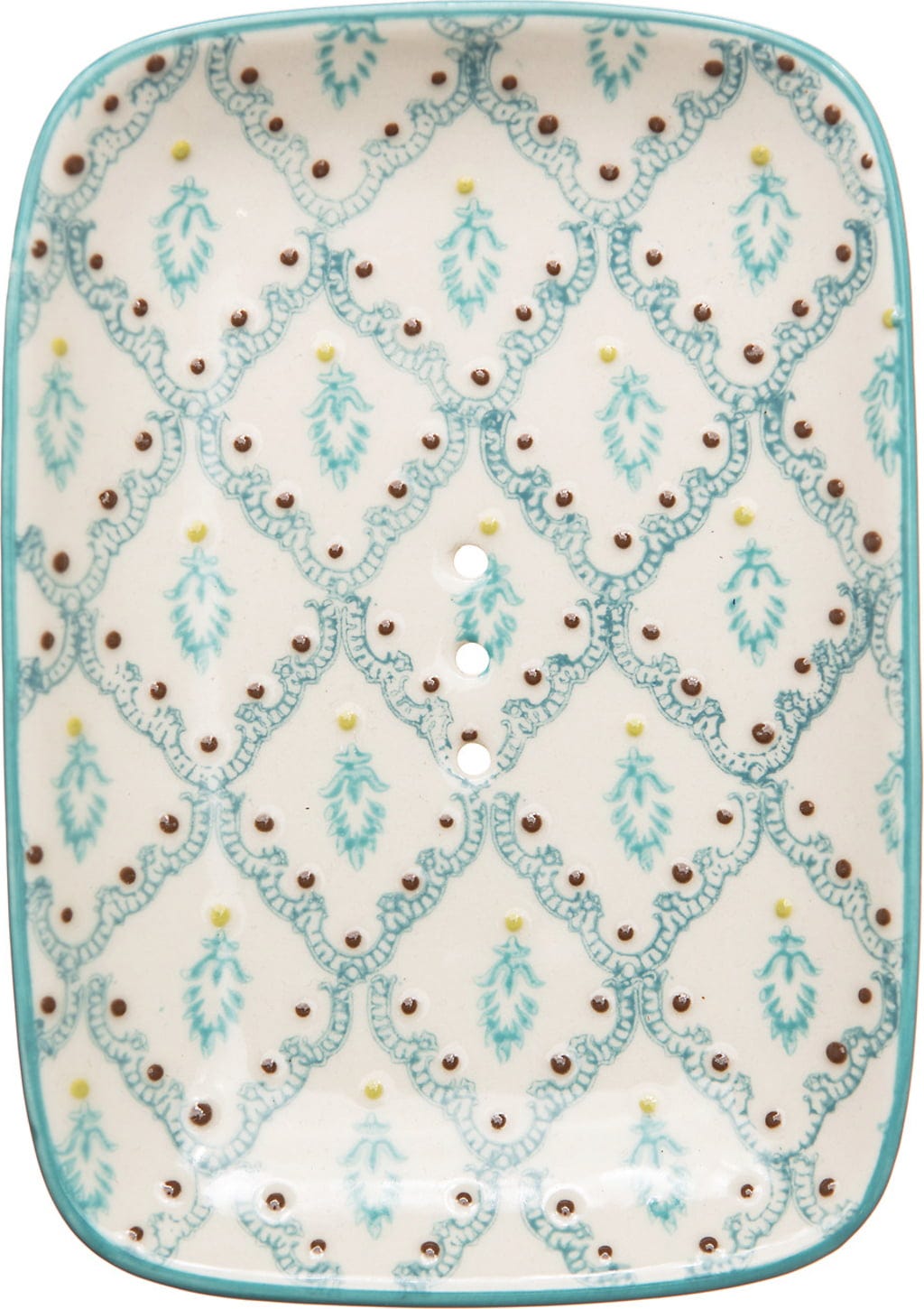 Prostokątny kształt z zaokrąglonymi rogami, delikatny, ręcznie stemplowany nadruk oraz otwory odpływowe umożliwiające odprowadzanie wody sprawiają, że ta mydelniczka to absolutny must-have w Twojej łazience! Jej filigranowy design w subtelnych kolorach przyciąga wzrok i nadaje wnętrzu indywidualny charakter.