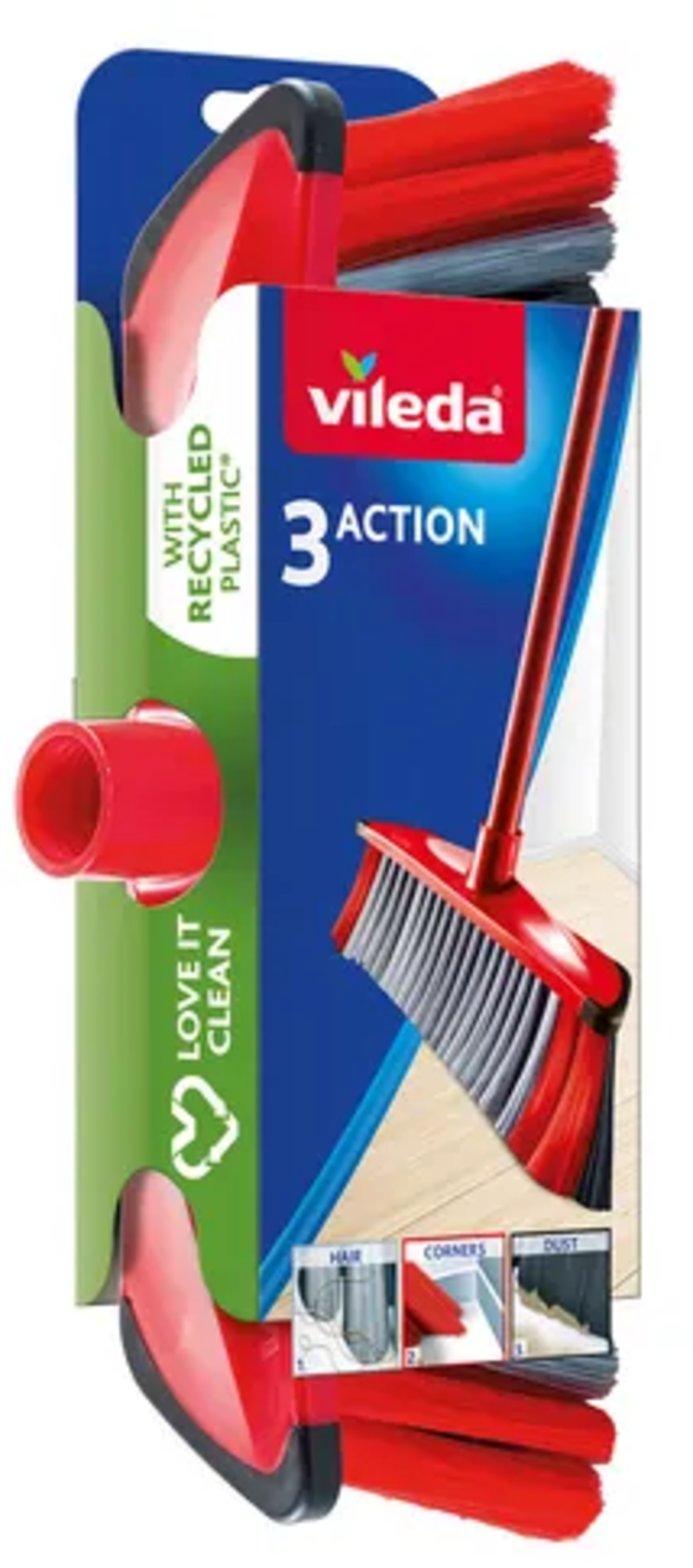 Szczotka miotły 3Action firmy vileda ma potrójne włosie, które niezawodnie wychwytuje zarówno drobny kurz, jak i większe zabrudzenia. Czarne, delikatne włosie usuwa najmniejsze cząsteczki brudu bez wzniecania kurzu. Większe zanieczyszczenia, takie jak okruchy lub włosy, są wychwytywane przez szare, gęstsze włosie. Zewnętrzne, czerwone włosie jest idealne do czyszczenia narożników, krawędzi i połączeń. Gumowe zderzaki chronią również podłogi i meble przed zarysowaniami.