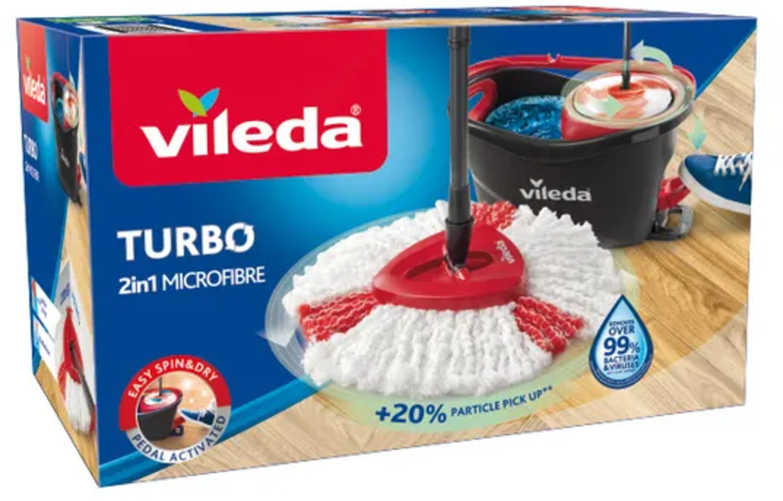 Kompletny zestaw Turbo 2in1 Easy Wring + Clean to najlepszy towarzysz w czyszczeniu podłóg. Dzięki mocnemu wirowaniu w wiadrze, ręczne wyciskanie mopa nie jest już konieczne.