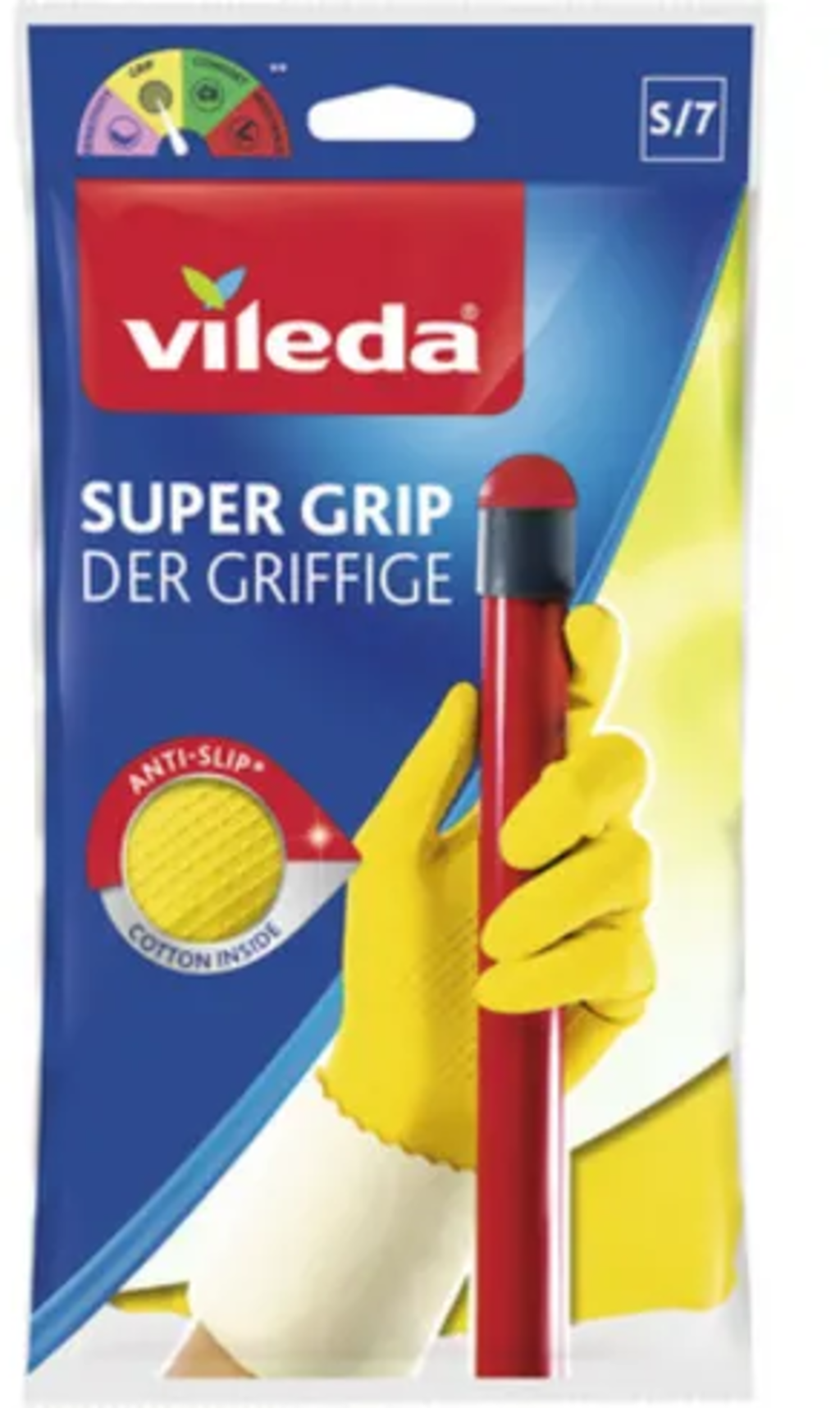 Antypoślizgowa rękawica do sprzątania Super Grip wykonana z naturalnego lateksu firmy vileda zapewnia optymalną ochronę podczas wszystkich prac domowych. Wewnętrzna powłoka ComfortPlus gwarantuje wysoką absorpcję wilgoci i komfort użytkowania.