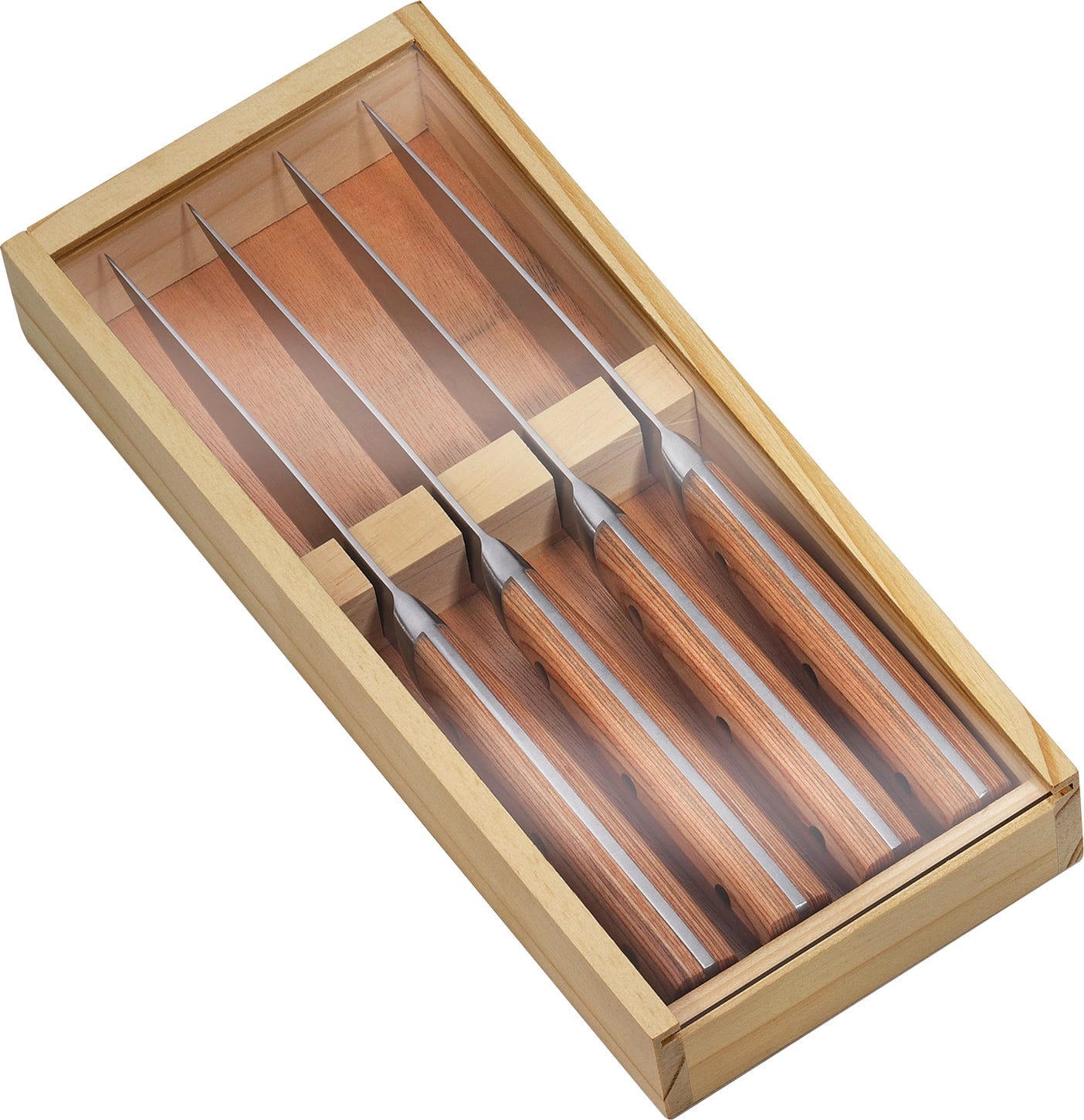 Dzięki zestawowi noży do steków ZASSENHAUS każdy stek stanie się atrakcją. Gładkie ostrza wykonane ze specjalnej stali tną precyzyjnie, a rękojeści z drewna pakka są bezpieczne i wygodne w trzymaniu. Różnice w usłojeniu i kolorze sprawiają, że każdy nóż jest wyjątkowy - doskonale zapakowany w atrakcyjne drewniane pudełko.